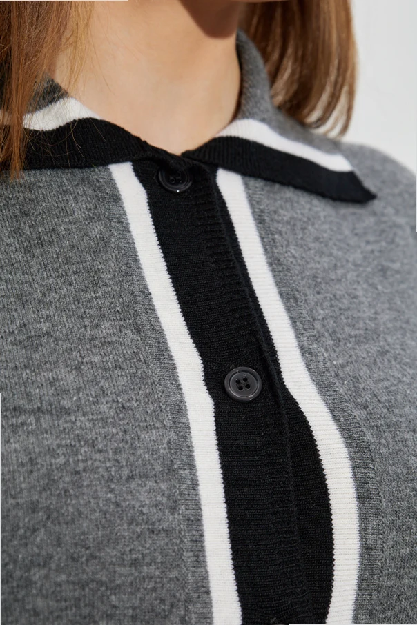 Den Charme des Ganzen unterstreichen kontrastierende Paspeln – Schwarz mit weißen Kanten – die die Vorderseite und den Kragen zieren und dem Gesamtbild einen einzigartigen und zugleich zeitlosen Charakter verleihen. Matte, minimalistische Knöpfe fügen sich harmonisch in die raffinierten Details ein. Ohne sichtbare Aufschriften oder Logos setzt der Cardigan auf Subtilität und edle Form.