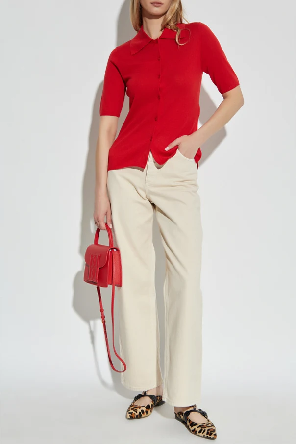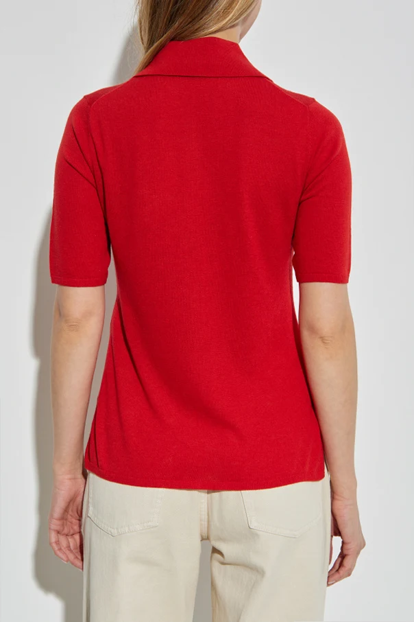 Das Modell besticht durch einen breiten, markant ausgearbeiteten Hemdkragen sowie einen sorgfältig gestalteten, anliegenden Schnitt der kurzen Ärmel, die knapp oberhalb des Ellbogens enden. Der Cardigan ist aus einem zarten, fein gestrickten Stoff mit dezentem Glanz gefertigt, der aus einer harmonischen Kombination von Lyocell, Wolle und edler Seide entsteht. Der minimalistische Schnitt ohne zusätzliche Verzierungen sowie die farblich abgestimmten, kleinen Knöpfe vervollständigen den eleganten Charakter des Produkts.