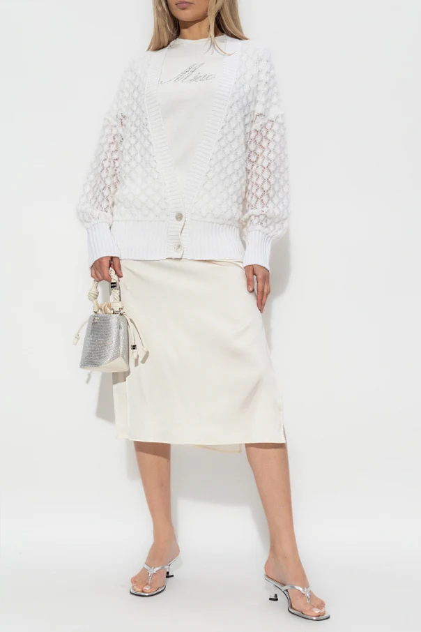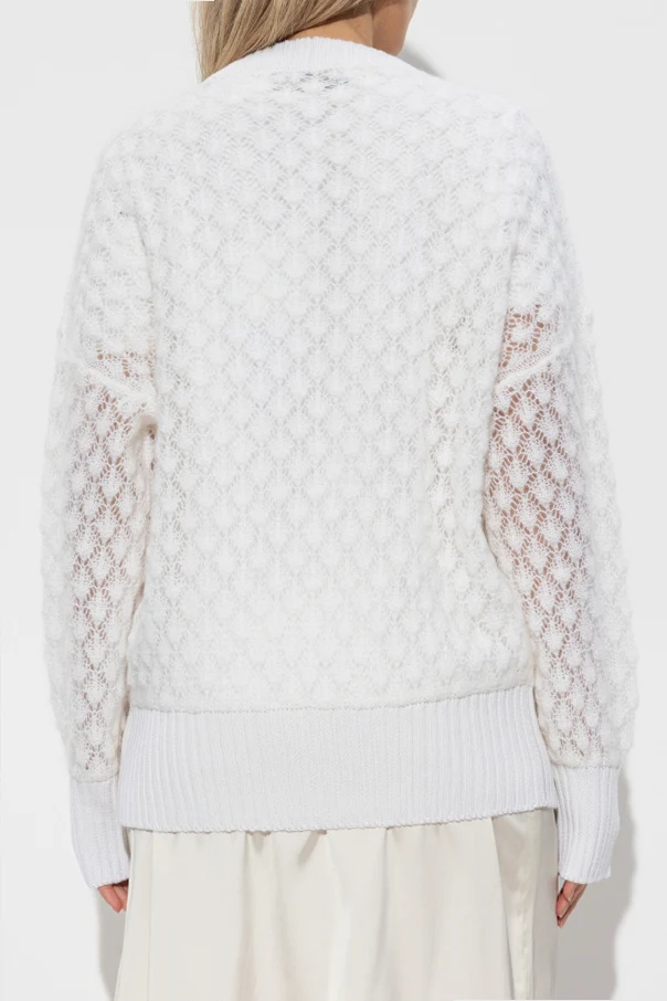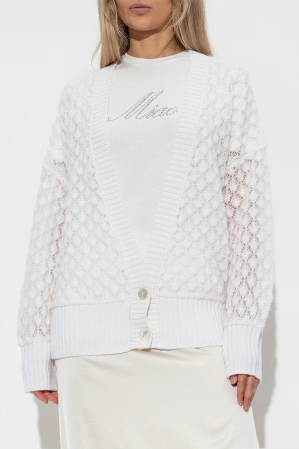 Kardigan mit Mohair-Veredelung von Blumarine ist die Quintessenz des raffinierten Stils der renommierten italienischen Tradition. Das Modell in dominierendem Weiß besticht durch ein filigranes Ajourmuster in Form kleiner Rauten und setzt einen besonders zarten, femininen Akzent. Sorgfältig ausgewählte Materialien – flauschiges Mohairgarn mit einem Zusatz von Wolle und Polyamid – sorgen für Weichheit, edles Aussehen und außergewöhnlichen Tragekomfort, während die halbtransparente, leichte Struktur die Silhouette angenehm umhüllt.