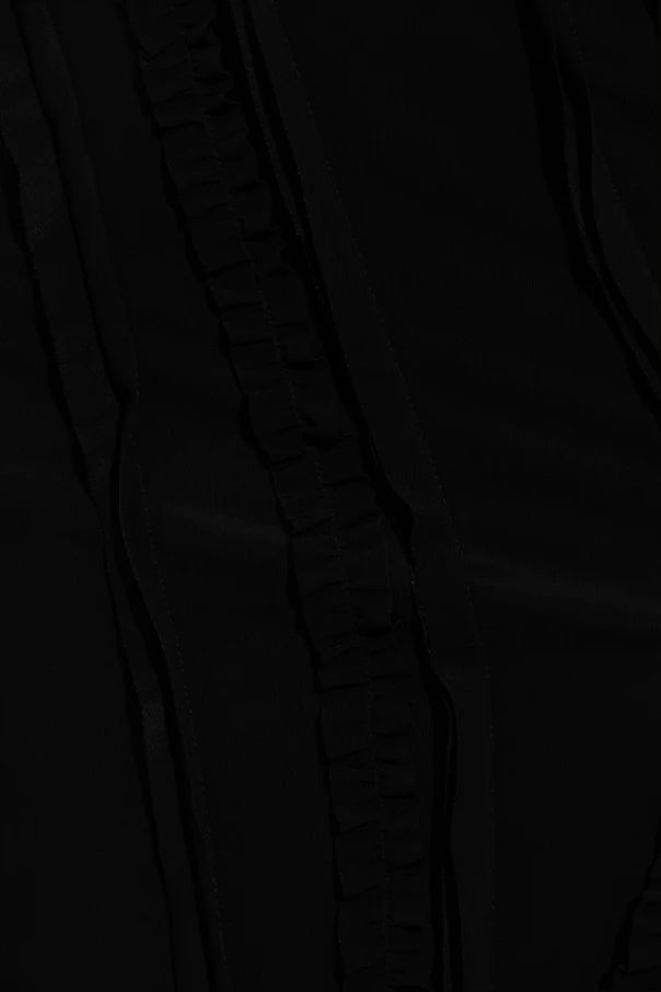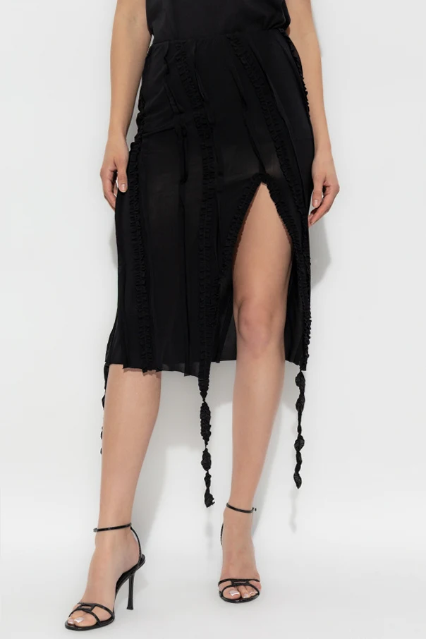 Die Einzigartigkeit dieses Rocks manifestiert sich durch kunstvoll platzierte, vertikale Applikationen sowie feine Raffungen, die der Komposition Tiefe verleihen. Ein zentrales Detail sind die verlängerten, geflochtenen Elemente, die locker am Saum herabfallen und alle Liebhaber der Schönheit in ihren Bann ziehen.
