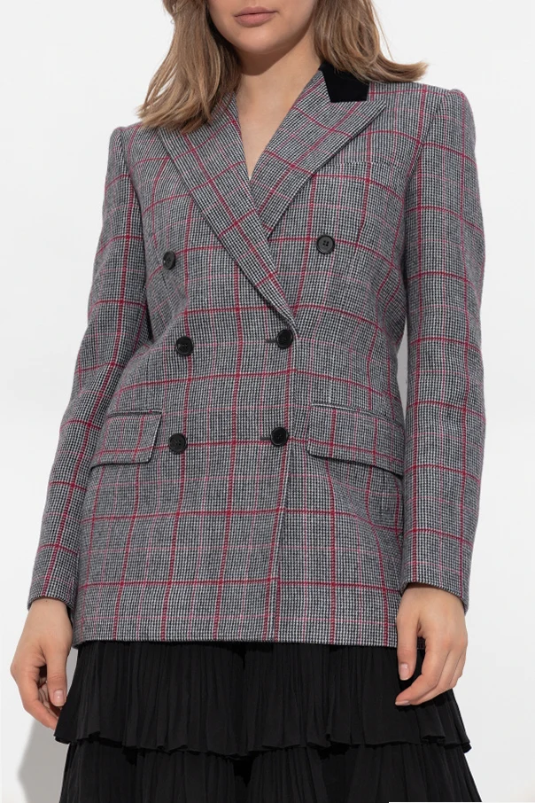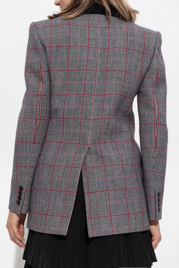 Doppelreihiger Blazer mit Karomuster von Chloé ist die Essenz raffinierten Stils, der auf die Leichtigkeit zeitgenössischer Eleganz trifft. Eine geschmackvolle Komposition aus Grautönen mit schwarzen und roten Akzenten, veredelt durch das klassische Glencheck-Karo und ein breites, rotes Overcheck, schafft eine außergewöhnliche Harmonie zwischen Tradition und modernistischer Frische.