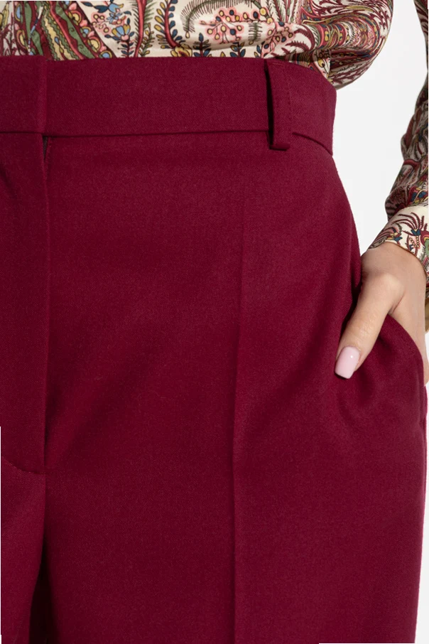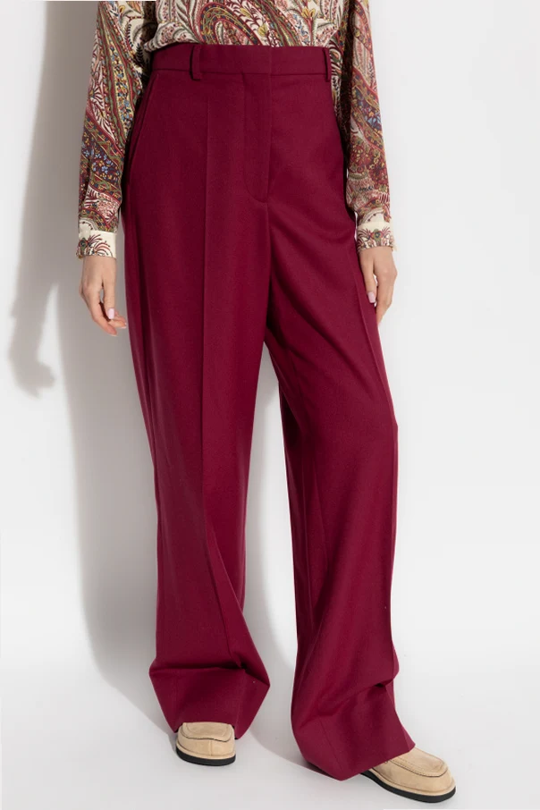 Wollhose mit Bügelfalten der Marke Stella McCartney ist die Quintessenz zeitloser Eleganz und raffinierter Handwerkskunst. Der tiefe Bordeaux-Ton besticht durch edle Raffinesse, während der gerade, locker geschnittene Fit mit weiten, über die gesamte Länge gebügelten Hosenbeinen die Silhouette dezent streckt und dank der hohen Taille die Körpermitte betont.