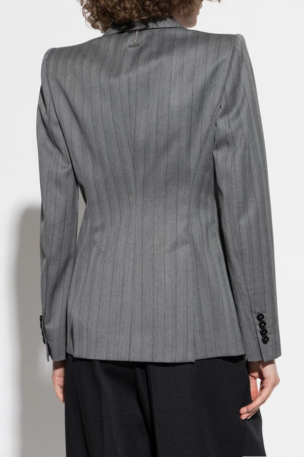 Wollblazer mit Fischgrätenmuster vom renommierten Modehaus Alexander McQueen verkörpert Exklusivität und modernes britisches Schneiderhandwerk. Die taillierte Passform mit leicht verlängertem Vorderteil, ausgeprägten Schultern und schmaler Taille zeugt von einem exzellenten Verständnis der Silhouette. Das dezente Fischgrätmuster mit fein gearbeiteten, vertikalen Streifen schafft einen außergewöhnlich raffinierten visuellen Effekt.