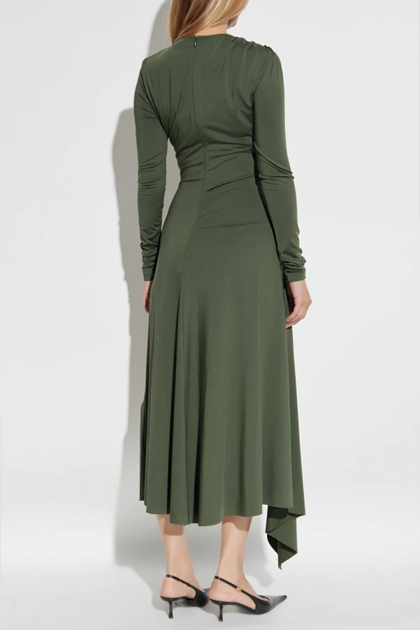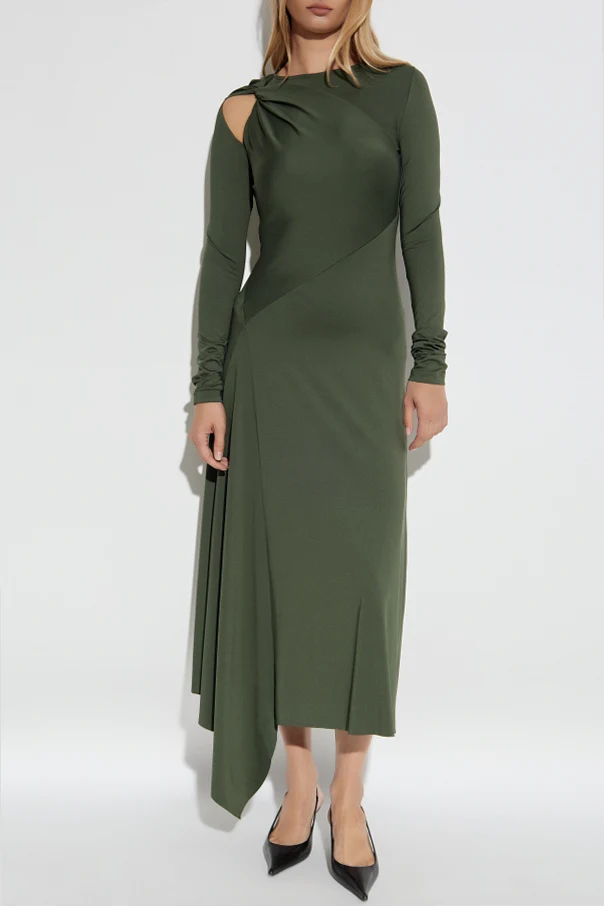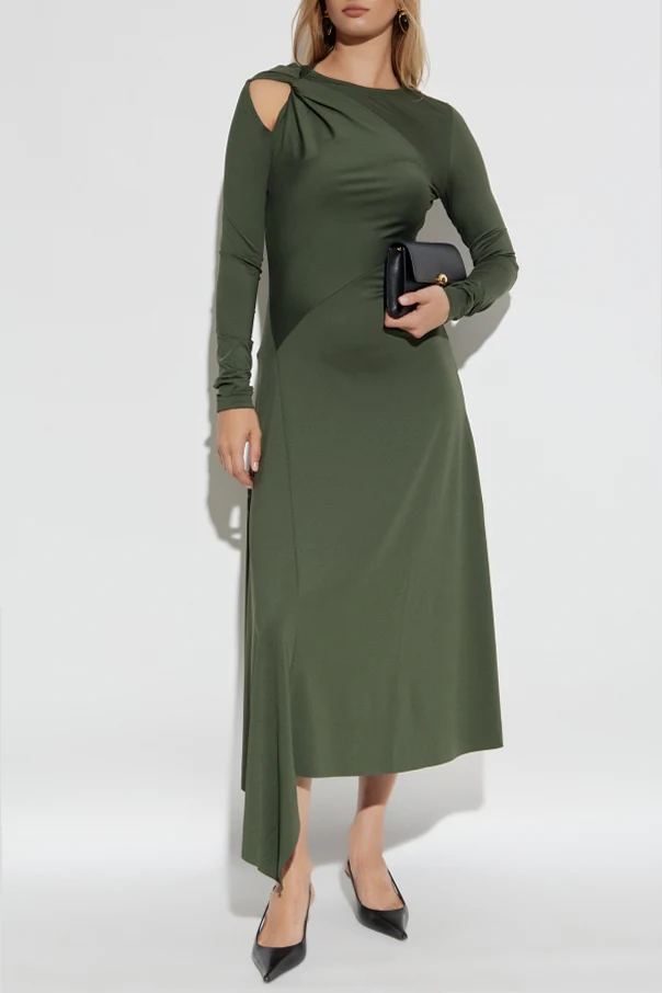 Asymmetrisches Kleid mit Drapierung ist eine raffinierte Wahl für Frauen, die Subtilität und modernen Chic schätzen. Der tiefe Olivgrünton harmoniert perfekt mit dem ausgefeilten Midi-Schnitt, der durch sinnliche Leichtigkeit besticht.