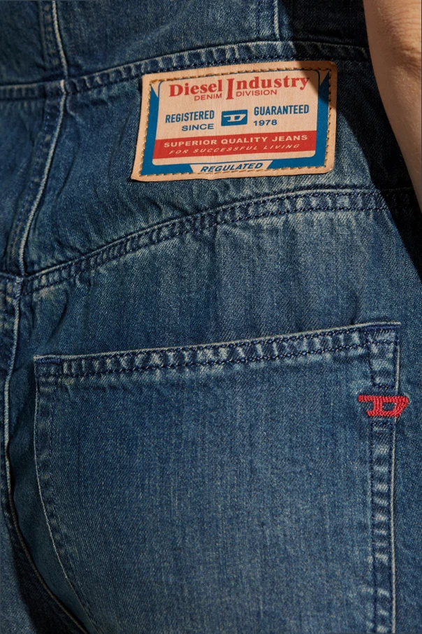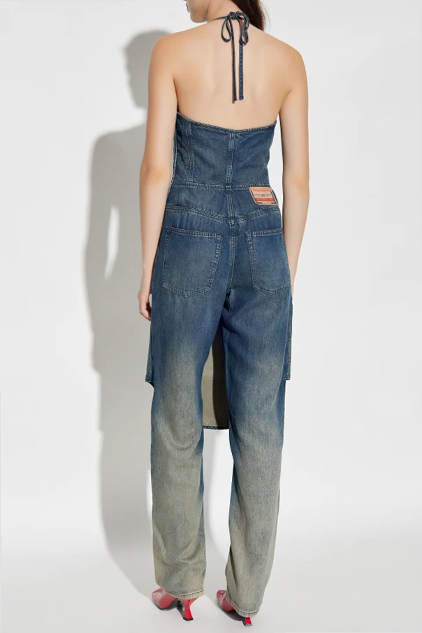 Der charakteristische Schnitt mit feinen, gebundenen Trägern im Halter-Stil und einer eindrucksvollen, schürzenähnlichen Verlängerung enthüllt harmonisch Schultern und Rücken und verleiht zugleich sinnliche Eleganz. Lange, leicht zulaufende Beine unterstreichen die ausgefeilte Silhouette. Einzigartige Akzente setzen das Metalllogo von Diesel am Ausschnitt sowie das große „Diesel Industry“-Patch am Rücken – ein prägnantes Zeichen moderner Markenidentität aus Italien.
