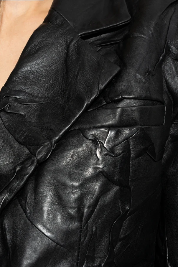 Die Jacke ist aus hochwertigem, weichem Lammleder mit mattem Glanz und markanter, unregelmäßiger Struktur gefertigt, die durch natürliche Nähte und rohe Abschlüsse akzentuiert wird. Das Innenfutter aus zartem Polyester garantiert außergewöhnlichen Tragekomfort. Dieses Modell ist die perfekte Wahl für Frauen, die sowohl Luxus als auch einen außergewöhnlichen Stil schätzen.