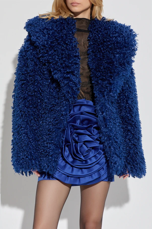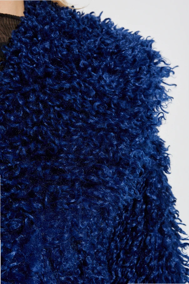 Kunstpelz der Marke ROTATE ist der Inbegriff von Luxus, Raffinesse und zeitgenössischer Ästhetik. Besonders ins Auge fällt sein tiefes Navyblau , das den modernen Charakter und die zeitlose Eleganz unterstreicht. Der Oversize-Schnitt mit breiten Schultern, lockeren Ärmeln und einem großzügigen Schalkragen verleiht der Silhouette Volumen und eine Aura von Exklusivität.