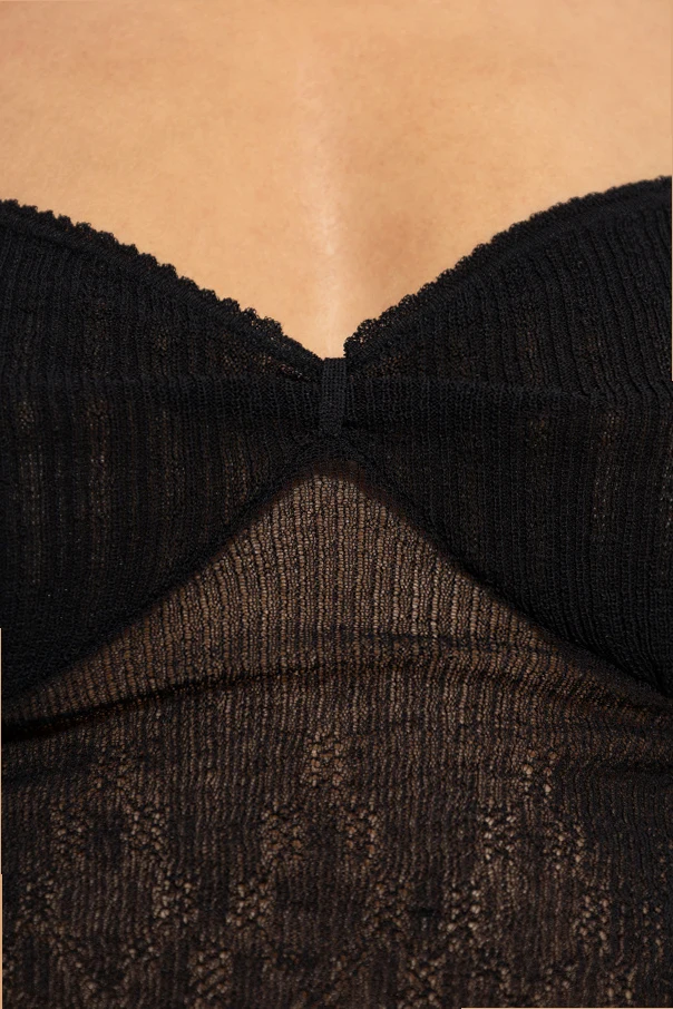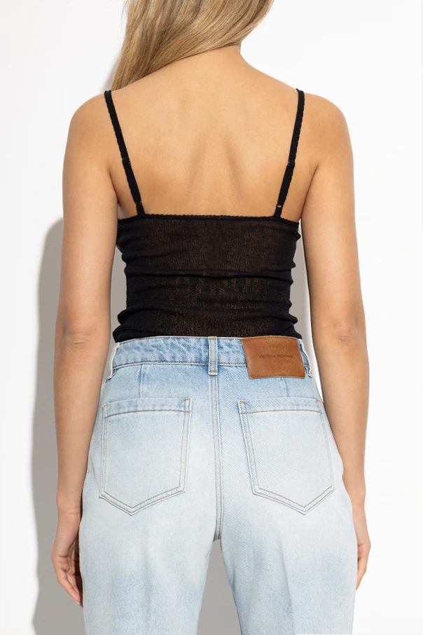 Das Trägertop von Victoria Beckham verkörpert subtile Eleganz in Perfektion. Das Modell aus hochwertigem, fein gestricktem Jersey in Schwarz strahlt raffinierte Schlichtheit aus. Die glatte Textur des Materials ist auf der Vorderseite leicht transparent, was einen Hauch von Leichtigkeit und Sinnlichkeit erzeugt und gleichzeitig höchsten Tragekomfort garantiert. Die schmalen, klassischen Träger und die vorgeformten Cups modellieren dezent die Silhouette, betonen Taille und Büste, ganz ohne zusätzliche Verzierungen oder sichtbare Logos.