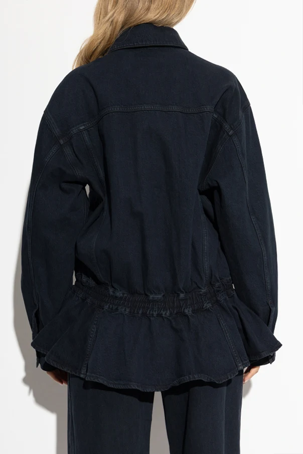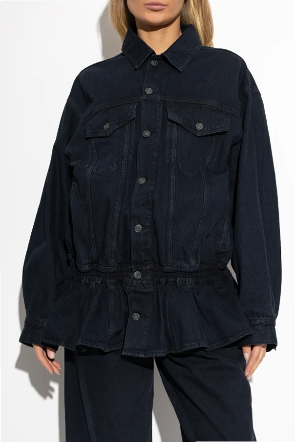 Die Jeansjacke mit Schößchen strahlt zeitlose Eleganz und Raffinesse aus und zieht mit ihrer außergewöhnlichen Form sowie meisterhafter Verarbeitung alle Blicke auf sich. Gefertigt aus hochwertigem, dunkelblauem Denim, begeistert sie mit einer leicht oversize geschnittenen Silhouette und betont dank des dezenten Schößchens am Saum die Figur, wodurch eine klar modellierte Taillenlinie entsteht.