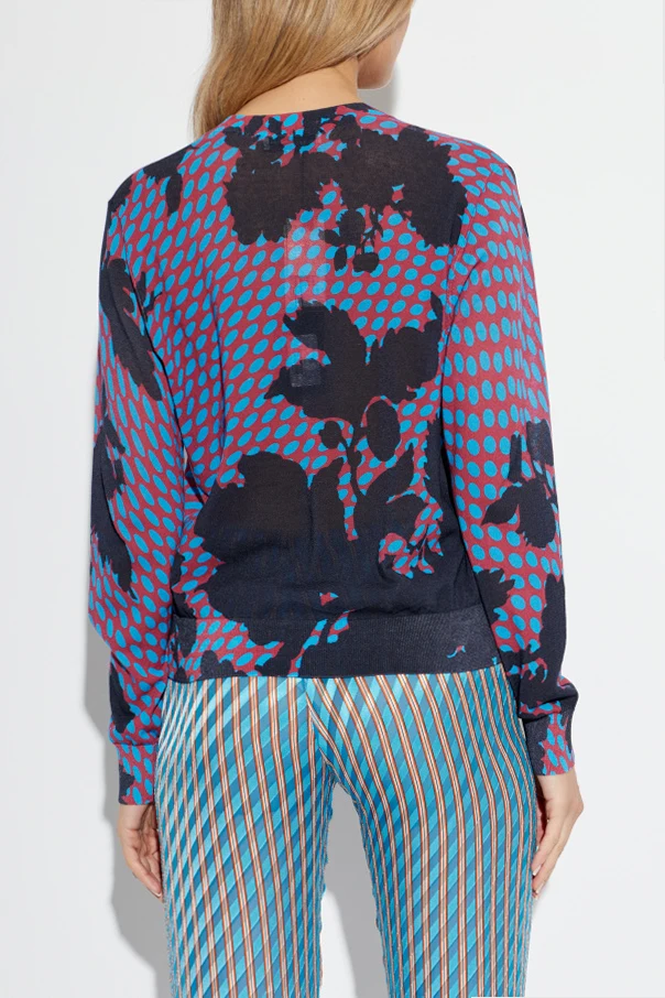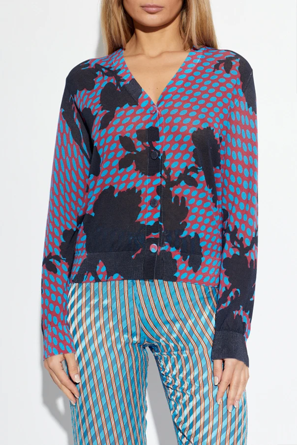 Gefertigt aus einem leichten, luxuriösen Strick, besticht der Cardigan durch ein ausdrucksstarkes Muster – hellblaue ovale Punkte auf rotem Grund harmonieren perfekt mit schwarzen, pflanzlichen Ornamenten, die über die gesamte Fläche verteilt sind. Der V-Ausschnitt und drei dezente Knöpfe vervollständigen das Design, während die sorgfältig gearbeiteten Abschlüsse an Ärmeln und Saum den exklusiven Charakter betonen.