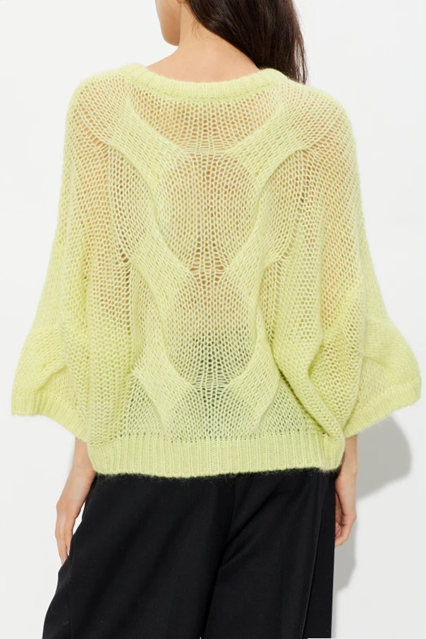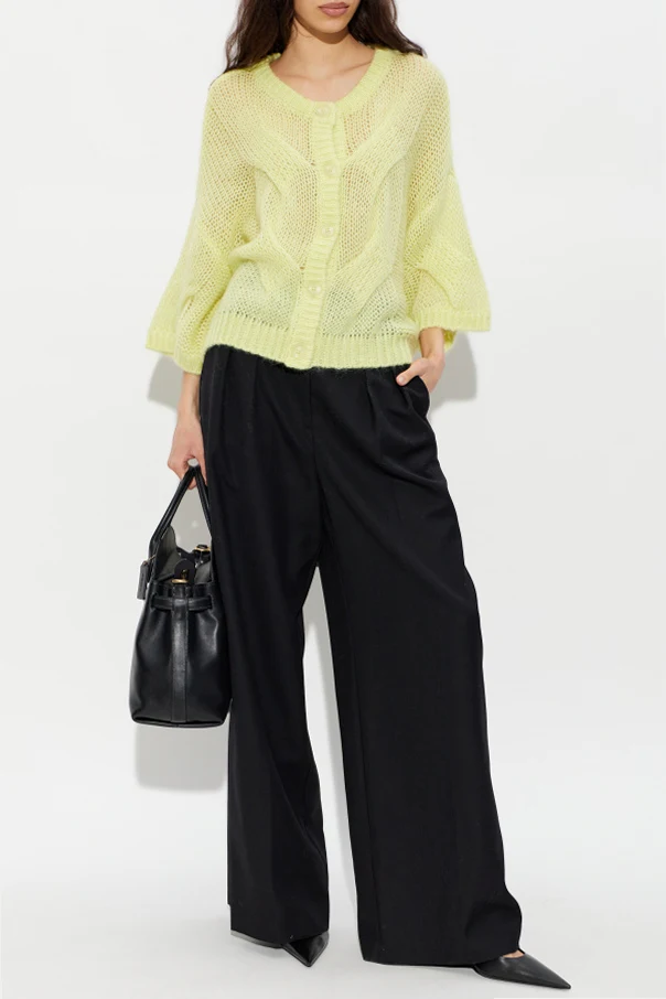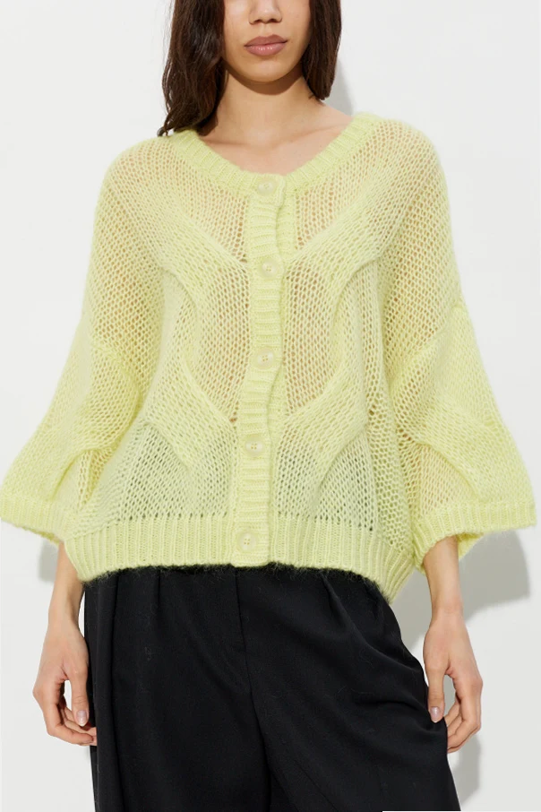 Hochwertiges, flauschiges Garn – eine subtile Mischung aus Mohair, Wolle und Polyamid – umhüllt sanft mit sinnlicher Weichheit und sorgt für außergewöhnlichen Tragekomfort. Der halbtransparente Charakter des Materials, in Verbindung mit der Neon-Farbe und großen, harmonisch abgestimmten Knöpfen, schafft ein einzigartiges Angebot im modernen Geist des skandinavischen Minimalismus.