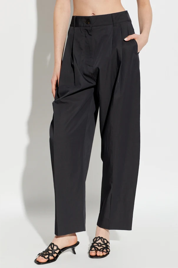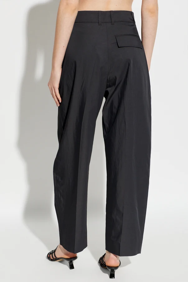 Der einzigartige Carrot-Fit-Schnitt kombiniert leicht zulaufende, weite Hosenbeine mit hohem Bund und breitem Taillenband, was das Bein subtil verlängert. Tiefe Falten auf der Vorderseite setzen ein raffiniertes Detail, während der verdeckte Verschluss und die Pattentasche hinten auf die Liebe zum Detail hinweisen. Der Verzicht auf ein sichtbares Logo unterstreicht die exklusive Zurückhaltung des Designs von Studio Nicholson .
