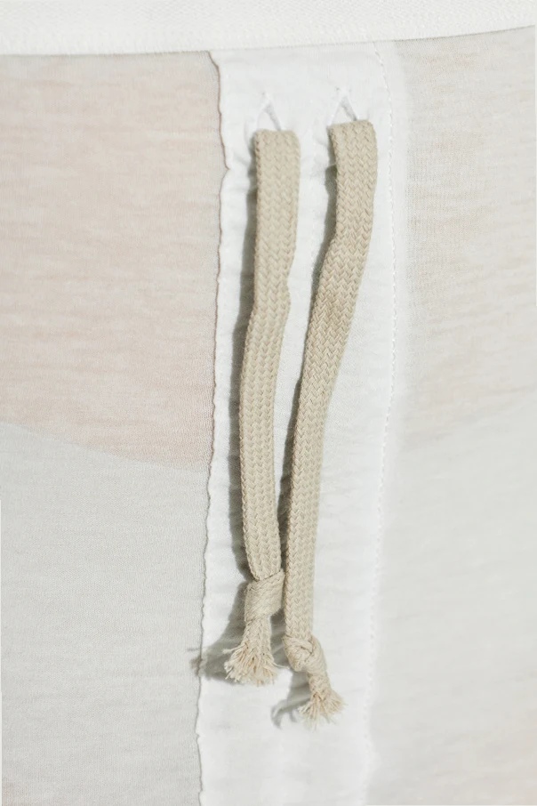 Das edle, zarte Baumwollmaterial begeistert durch seine Leichtigkeit und Atmungsaktivität , während die markante Naht, die sich über die gesamte Länge zieht, dem Gesamtbild eine außergewöhnliche Note verleiht. Besonders ins Auge fällt der beigefarbene Kordelzug in der Taille mit kunstvoll gearbeiteten Enden, der Individualität unterstreicht und eine perfekte Anpassung ermöglicht.