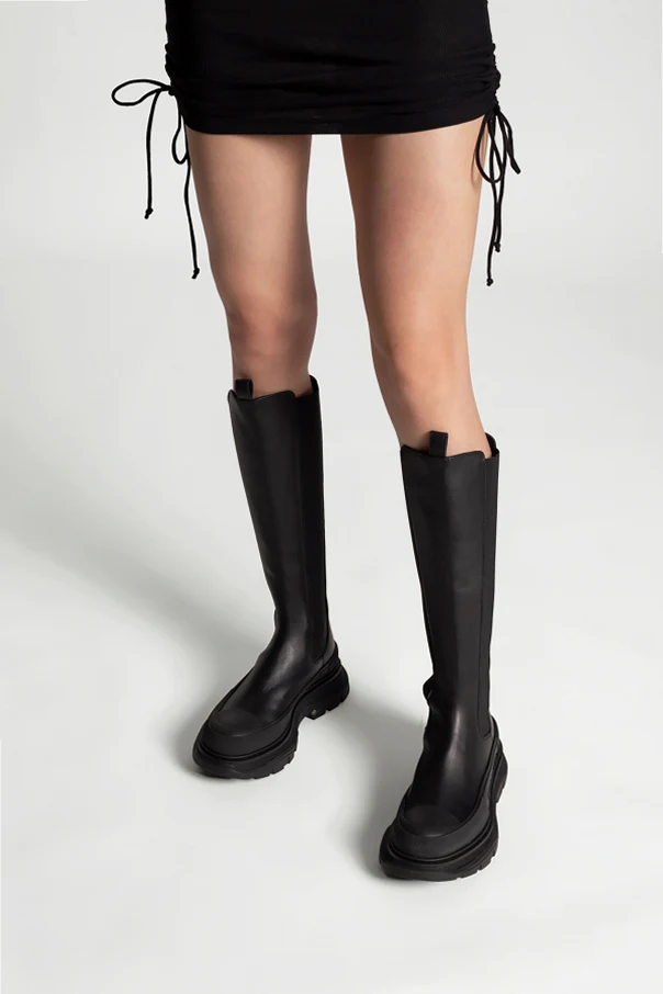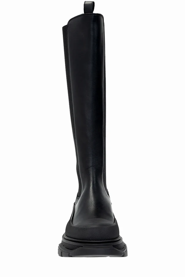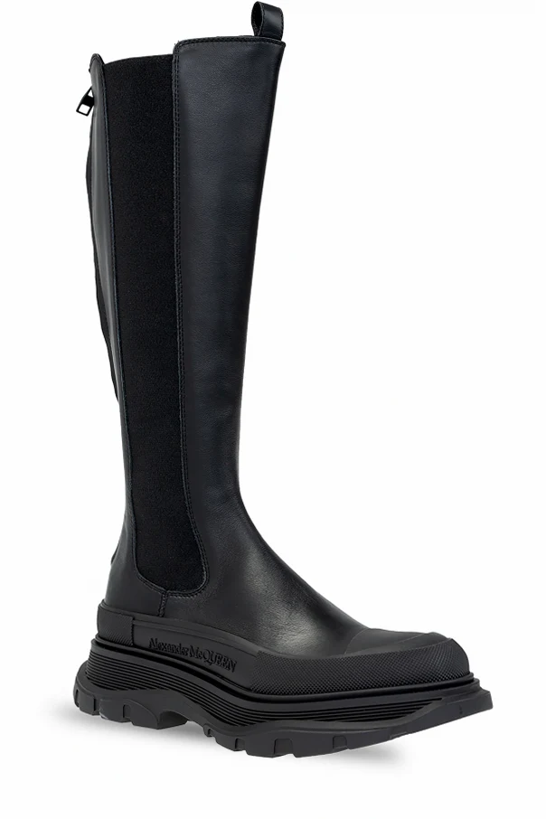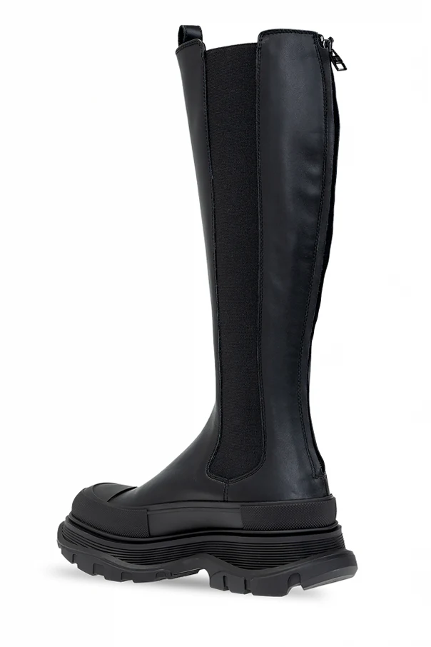 Black ‘Tread’ knee-high-boots from Alexander McQueen. Crafted from leather, this model sits on a black rubber sole and showcases the brand's logo, a back zip fastening, rubber trims and elastic panels on the sides.
