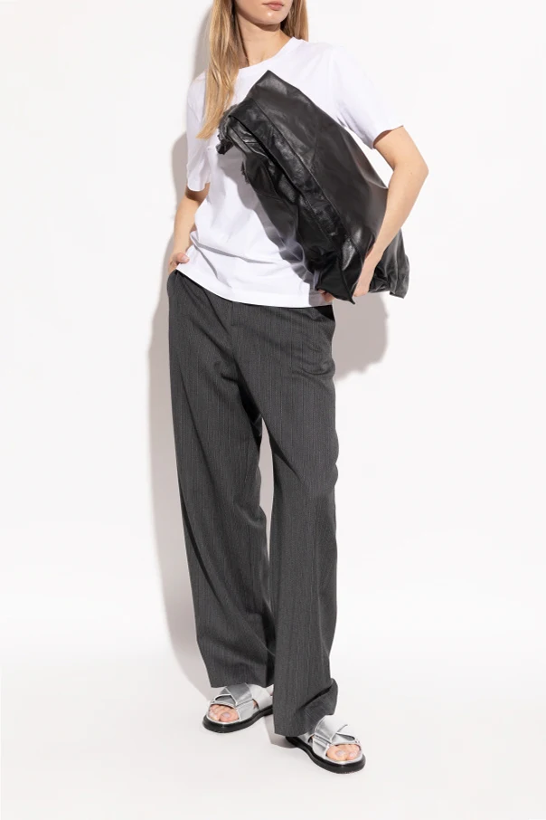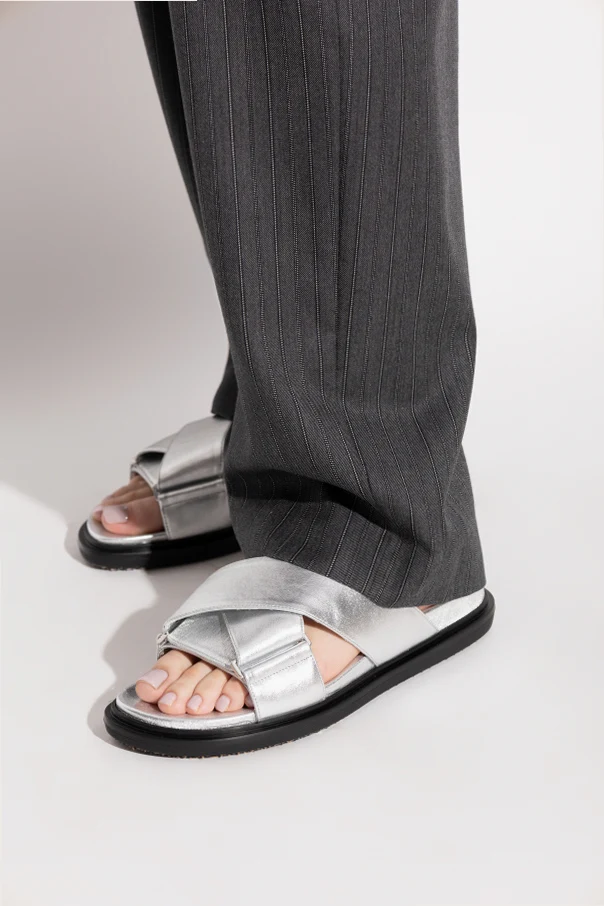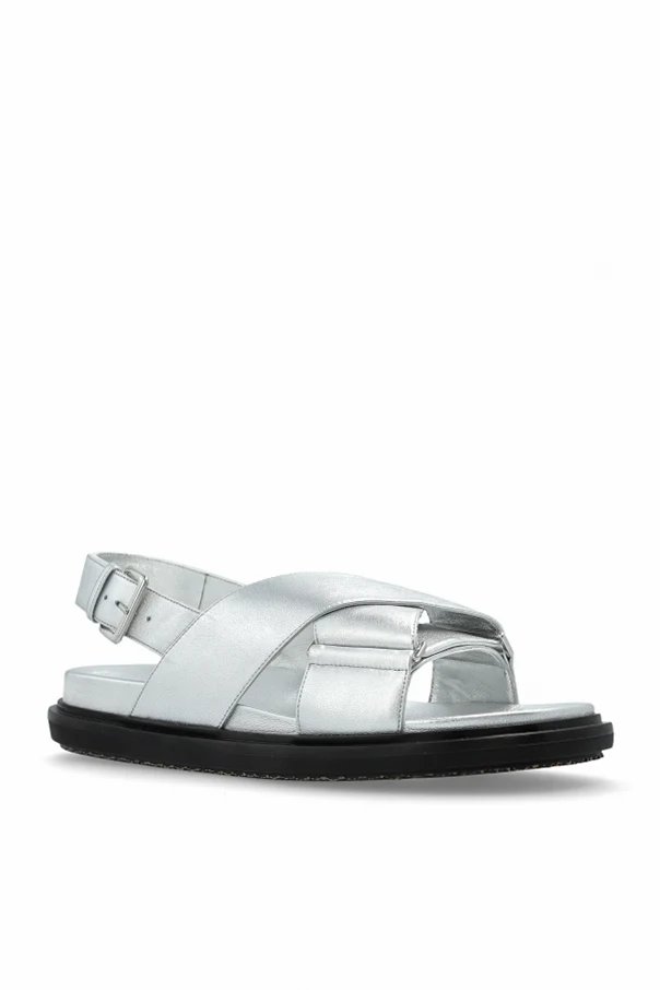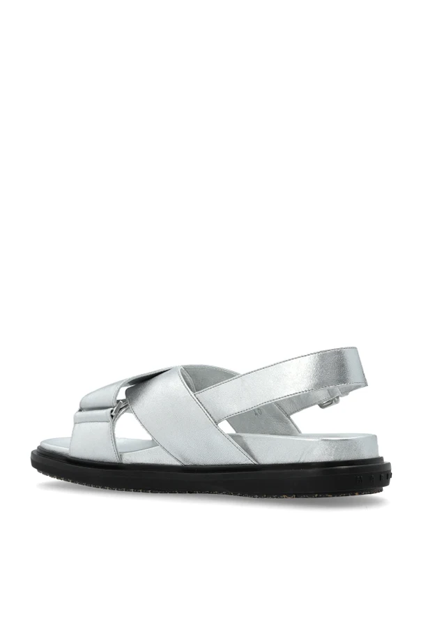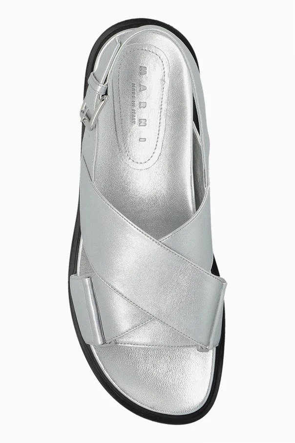 Wir präsentieren Ledersandalen aus der exklusiven Kollektion der italienischen Marke Marni . Hergestellt aus hochwertigem silbernem Leder, bieten sie Eleganz und Glanz, die alle Blicke auf sich ziehen. Das moderne Design mit sich kreuzenden breiten Riemen sorgt sowohl für Stabilität als auch für einen stilvollen Look.