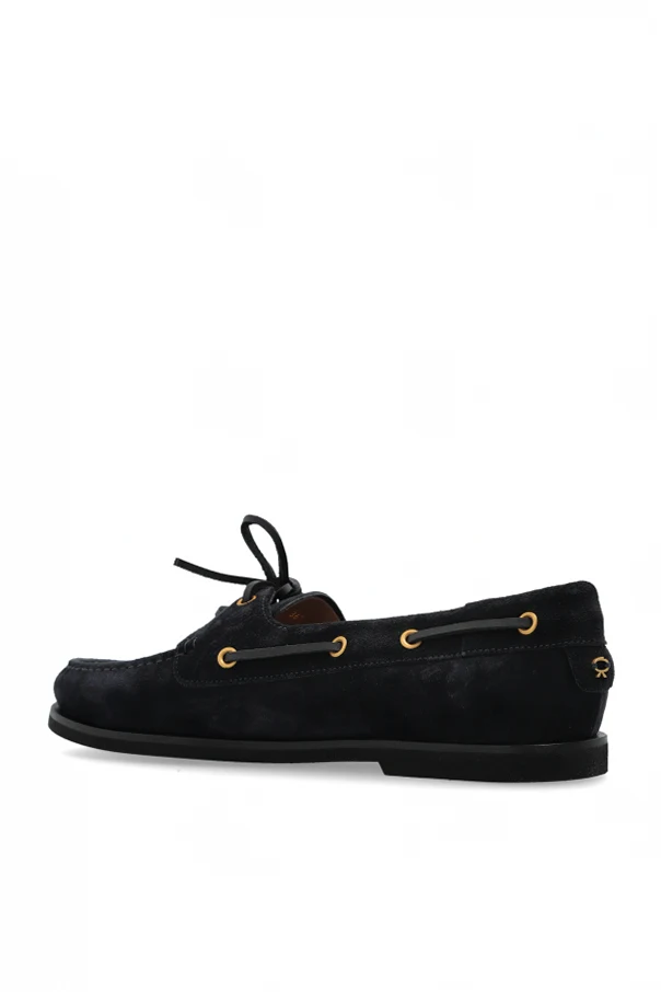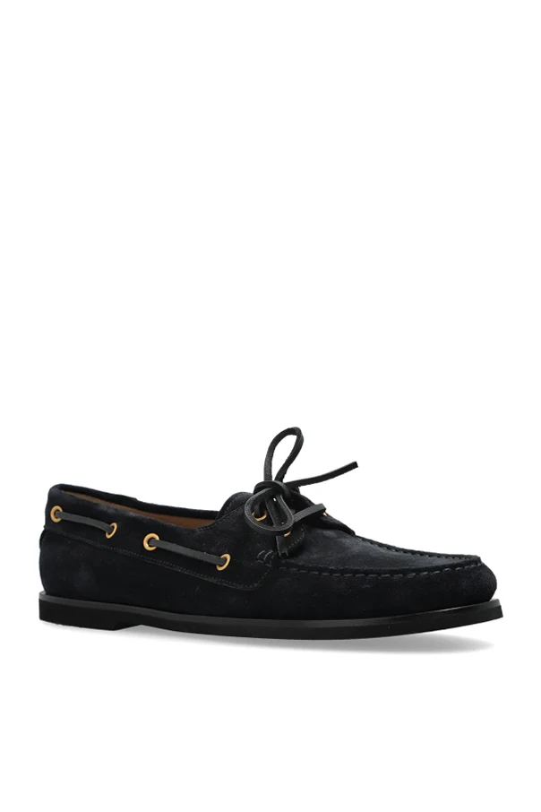 Charakteristische Schnürung vorne und dekorative Nähte in Kombination mit goldfarbenen Metallösen bilden ein harmonisches Ganzes und unterstreichen ihren raffinierten Stil. Die dominierende marineblaue Farbe verleiht ihnen einen einzigartigen Charme, und das Designer-Logo auf der Innensohle ist ein dezenter Hauch von Luxus.