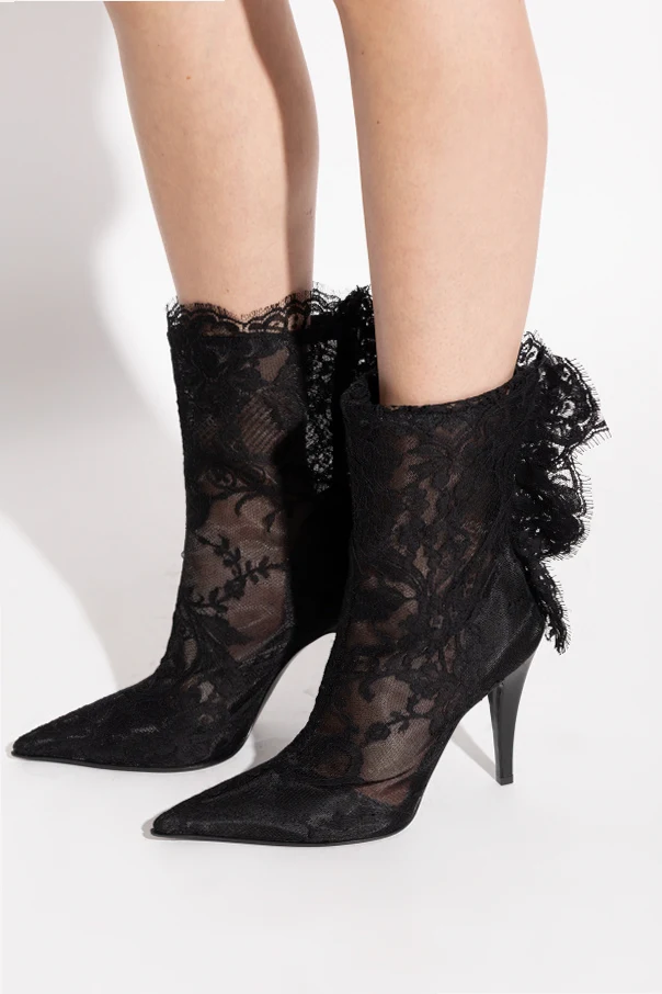 Das dominante, transparente Material aus schwarzer Spitze umhüllt den Fuß sanft und bringt florale, ornamentale Muster zur Geltung, was einen Eindruck von Leichtigkeit und Luxus vermittelt. Einzigartiges Detail der Stiefeletten ist die asymmetrische, dekorative Rüsche, die entlang der Rückseite des Schafts verläuft – ein Hingucker, der das Produkt von anderen abhebt.
