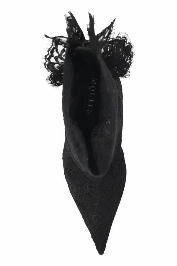 Spitzen-Stiefeletten 'Heron' von Alexander McQueen sind eine Hommage an kultivierte, moderne Eleganz. Die schlanke, verlängerte Silhouette mit spitz zulaufender Kappe und dem hohen, fein gearbeiteten Stiletto-Absatz betonen den sinnlichen Charakter dieses Schuhwerks.