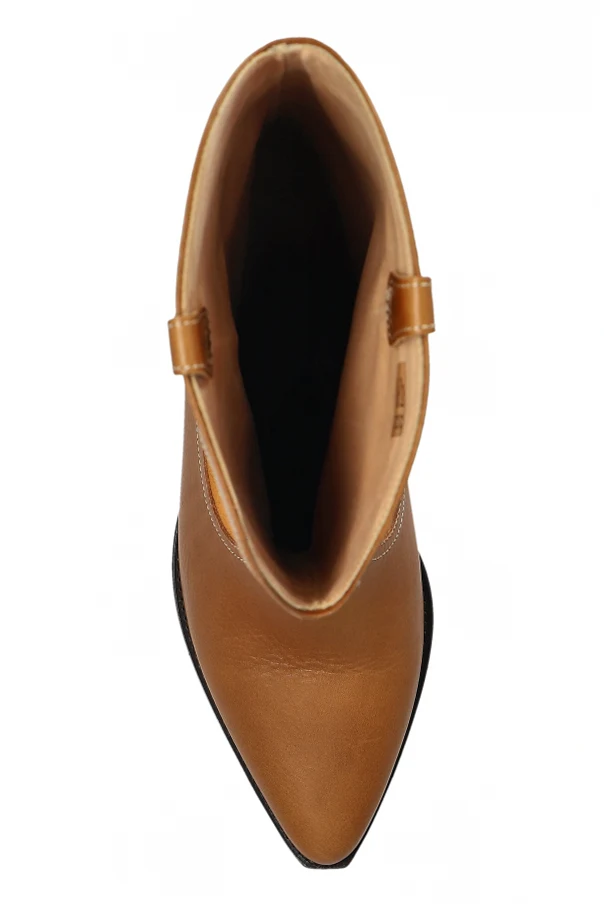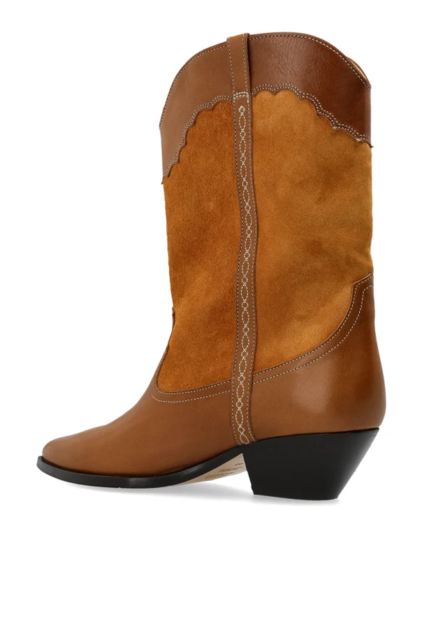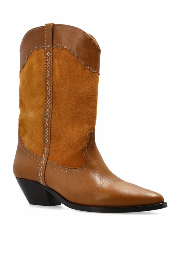 Duerto Stiefeletten mit Absatz von Isabel Marant sind eine raffinierte Wahl für Liebhaberinnen eines charakterstarken Stils. Das vom klassischen Cowboyboot inspirierte Design besticht durch die schlanke, verlängerte Schaftlinie, die knapp unter das Knie reicht, sowie die leicht spitz zulaufende Zehenpartie, die die feminine Silhouette elegant betont. Die harmonische Kombination aus glattem Premium-Leder und feinem Veloursleder verleiht dem Schuhwerk eine außergewöhnlich exklusive Ausstrahlung und präsentiert zwei edle Brauntöne – warmes Velours und ein intensiveres Braun des Glattleders.