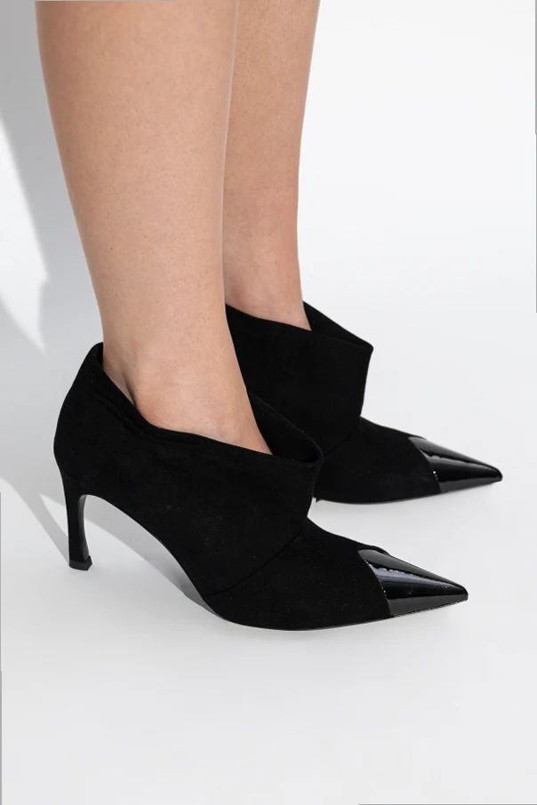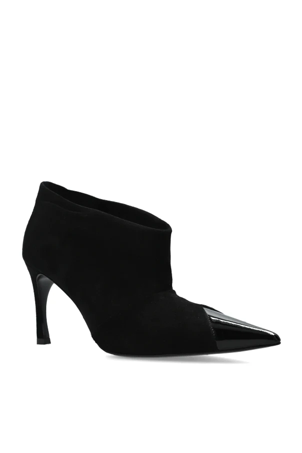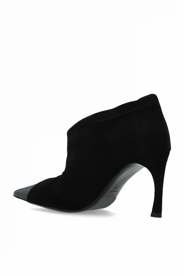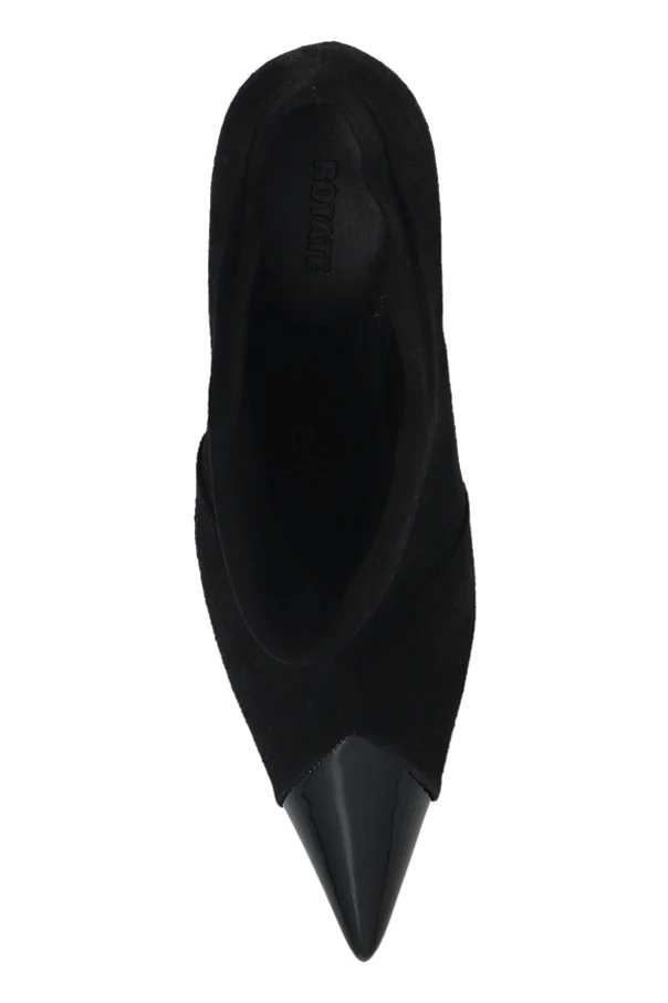Wildleder-Stiefeletten mit Absatz von ROTATE verkörpern die Quintessenz von raffinierter Minimalistik und zeitloser Eleganz. Die verführerische Ankle-Boot-Silhouette mit dezent betonter, schmaler Spitze verleiht der Figur Leichtigkeit, während der schlanke, mittelhohe Absatz die Distinktion des Schritts unterstreicht. Im Mittelpunkt steht erstklassiges schwarzes Wildleder, das im Kontrast zur glänzenden, glatten Kappe steht – diese Verbindung der Texturen schafft eine außergewöhnliche visuelle Spannung, ohne jedoch die homogene, tiefe Schwarztönung zu verlieren.