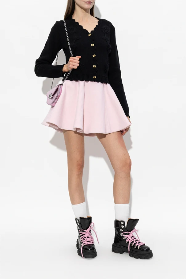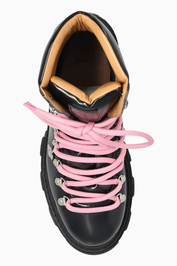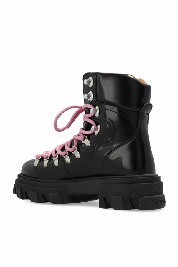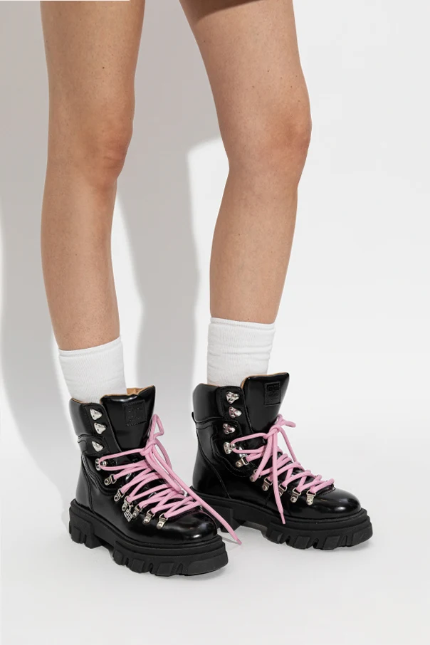 „Cleated Mountain“-Schuhe der Marke Ganni sind ein äußerst raffiniertes Angebot für Kennerinnen außergewöhnlicher Eleganz. Dieses Modell zeichnet sich durch eine massive Silhouette aus, die über den Knöchel reicht, mit einer charakteristischen, markant profilierten Gummisohle, die deutlich vom Trekking inspiriert ist. Die dominante schwarze Farbe des glatten, glänzenden Schafts steht in harmonischem Kontrast zu einem modernen Akzent – den breiten, pinkfarbenen Schnürsenkeln, die dem Ganzen Ausdruckskraft verleihen.