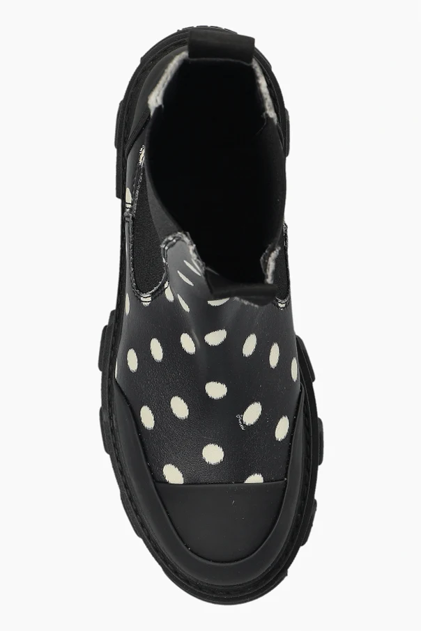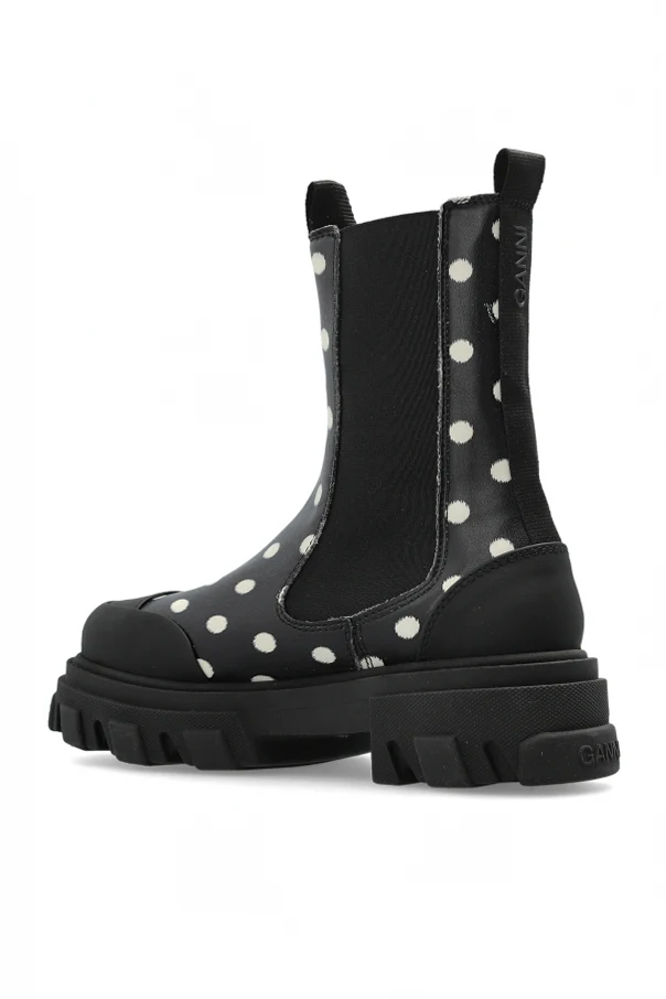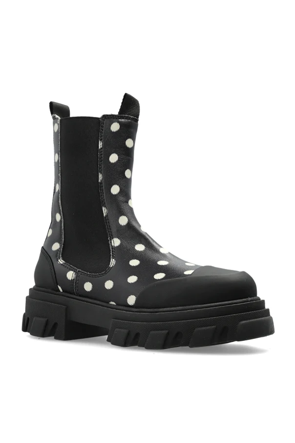 Entdecken Sie den einzigartigen Ausdruck von Stil, verborgen in den Punktmuster-Stiefeletten der Marke Ganni. Dieses Schuhmodell, gehalten in einem tiefen Schwarzton, begeistert mit einem hohen Chelsea-Schaft , der dezent über dem Knöchel endet. Das regelmäßige Muster aus weißen Punkten (polka dot) unterstreicht subtil den individuellen Charakter des Produkts und schafft einen eindrucksvollen Kontrast zur universellen schwarzen Farbe.