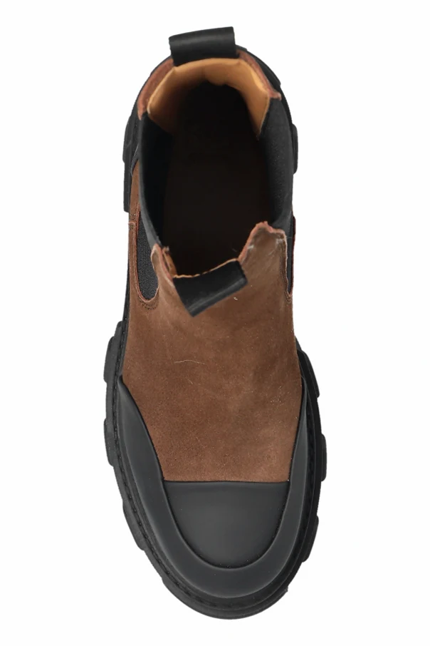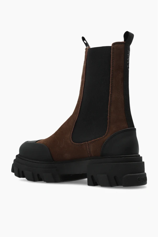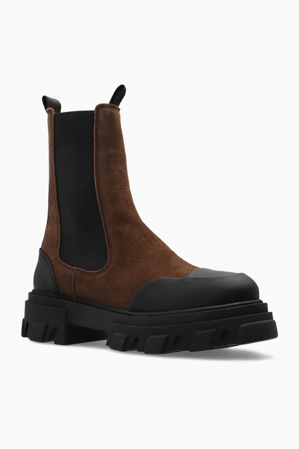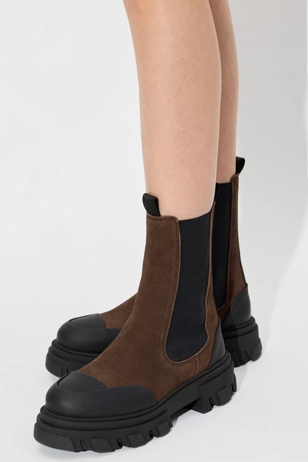 Wir präsentieren die Stiefeletten der Marke Ganni – ein Inbegriff von raffinierter Minimalistik und Funktionalität. Dieses Modell, inspiriert vom klassischen Schnitt der Chelsea Boots, besticht durch eine edle Silhouette sowie die perfekte Kombination aus braunem Wildleder am Schaft und breiten, elastischen, schwarzen seitlichen Einsätzen. Die markante, massive Profilsohle sowie die Gummikappen an Zehen- und Fersenpartie sorgen für Langlebigkeit und einen außergewöhnlichen Kontrast. Doppelte Zugschlaufen unterstreichen subtil den funktionalen Charakter des Schuhs und erleichtern das Anziehen. Das vollständig aus hochwertigem Gummi gefertigte Innenfutter umschließt den Fuß angenehm und garantiert Feuchtigkeitsbeständigkeit. Das Gesamtbild ist in einer zurückhaltenden, eleganten Farbpalette mit einem akzentuierten braunen Schaft gehalten.