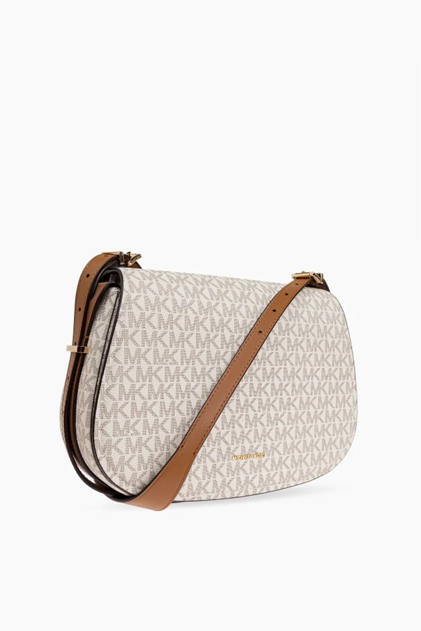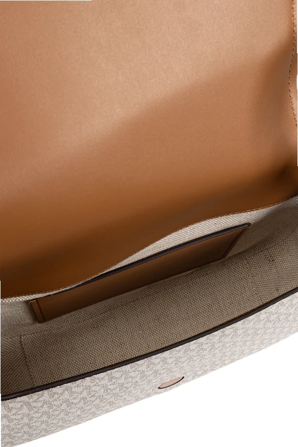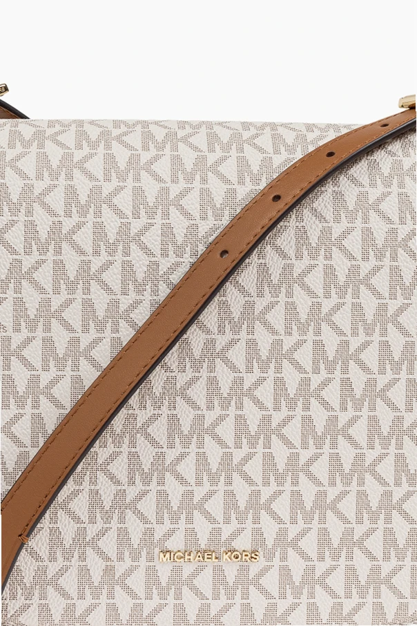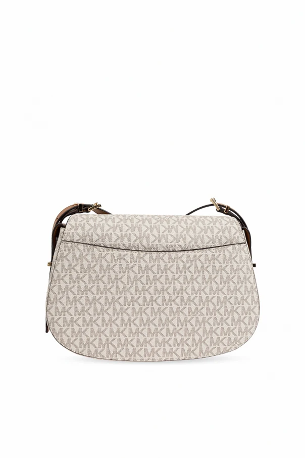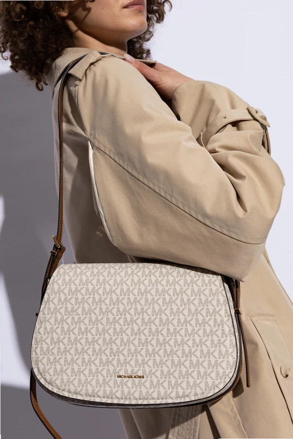 Die Tasche besticht durch ihre abgerundete Form mit Klappverschluss und das charakteristische „MK”-Monogramm , das typisch für diese renommierte Marke ist. Gefertigt aus strapazierfähigem Canvas und Leder, begeistert sie mit ihrer klassischen cremefarbenen Optik, die perfekt mit dem braunen, verstellbaren Riemen harmoniert.