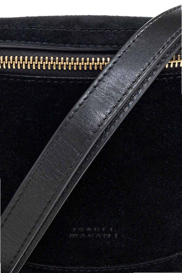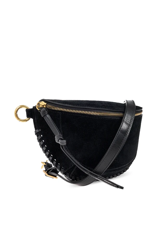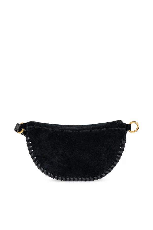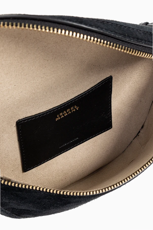 Wir präsentieren die BELT BAG 'Skano' – ein raffiniertes Angebot aus der Kollektion von Isabel Marant, einer Designerin, die als Wunderkind der französischen Mode gilt. Diese schwarze Tasche in halbkreisförmiger Form, aus luxuriösem Wildleder gefertigt, strahlt Eleganz und subtile Schönheit aus.