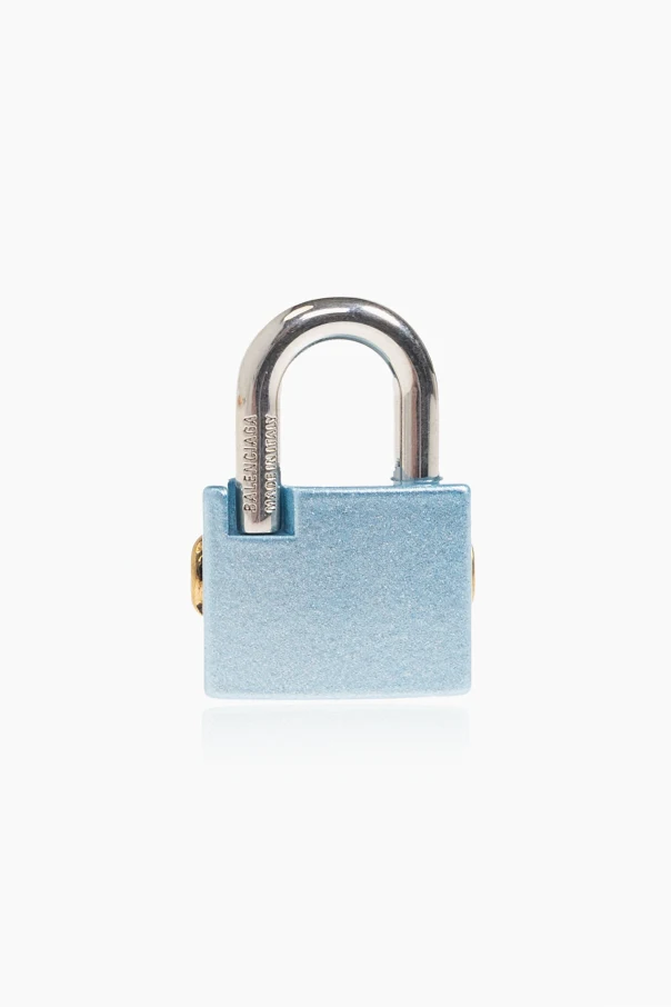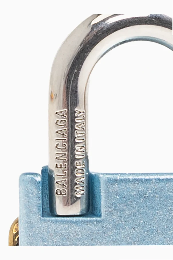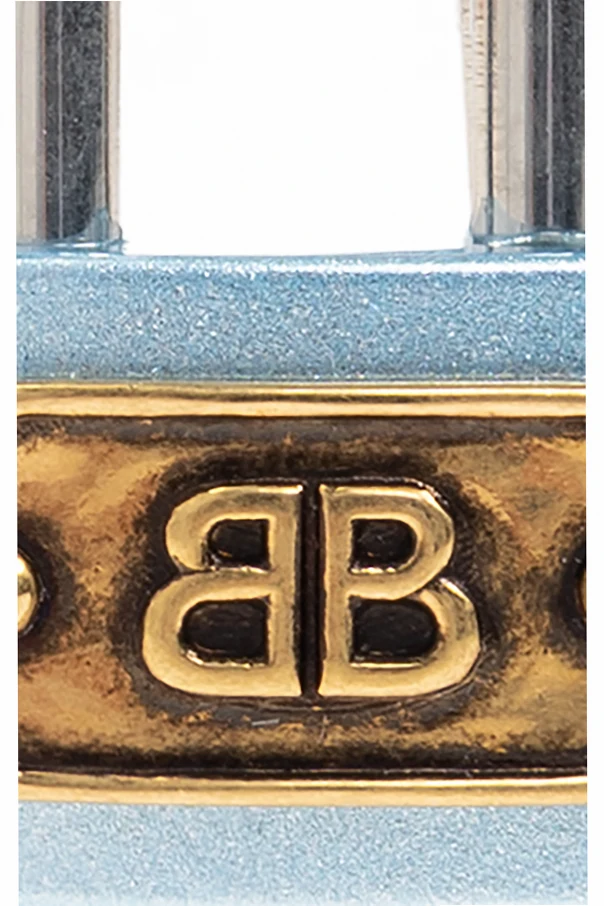 Der präsentierte Anhänger in Form eines Vorhängeschlosses von Balenciaga setzt einen raffinierten Akzent, der jedes Outfit veredelt. Der Korpus in Blau , gefertigt aus matt lackiertem Messing, steht in subtilen Kontrast zum glänzenden Bügel aus Edelstahl. Das charakteristische, antik anmutende Plättchen in vergoldetem Farbton mit dem doppelten „BB“-Monogramm unterstreicht das einzigartige Erbe der Marke.