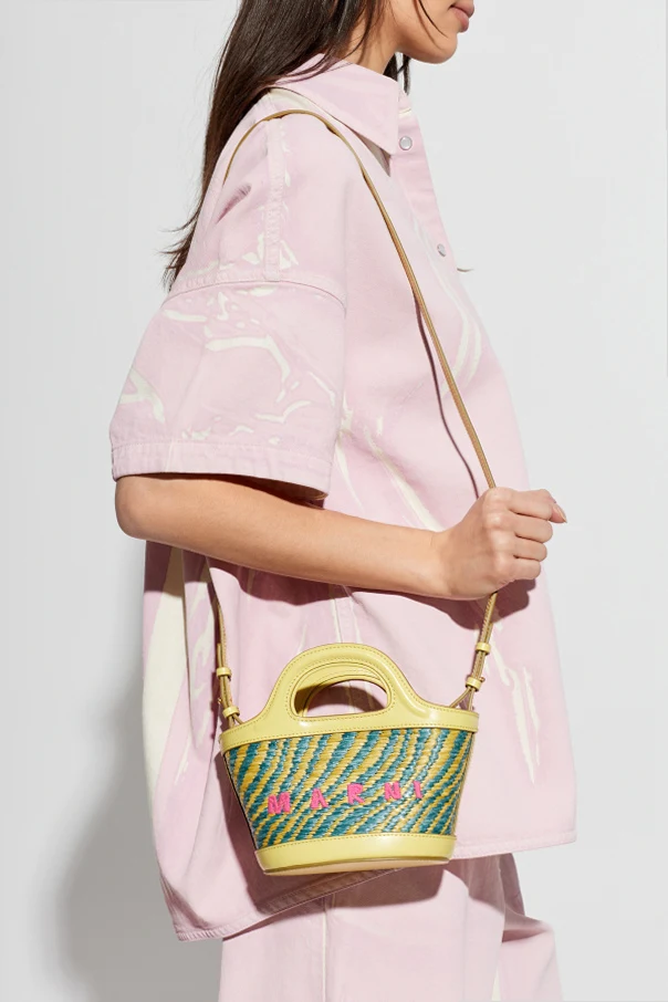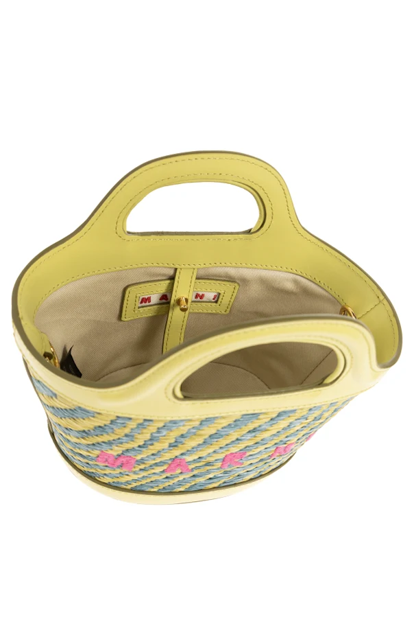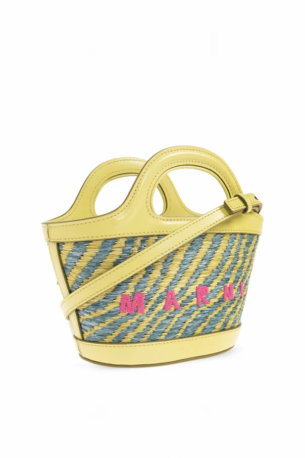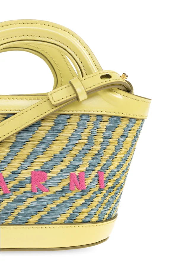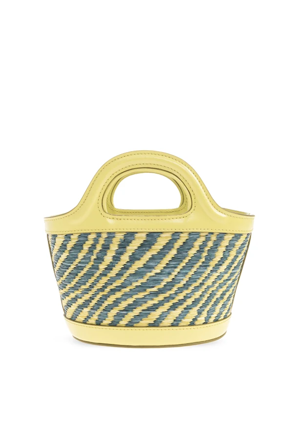 Handtasche „Tropicalia Micro“ ist die Quintessenz des raffinierten Stils der Marke Marni. Dieser Korb mit dezent trapezförmigem Design und abgerundeten Kanten begeistert durch die meisterhafte Kombination geflochtener Fasern mit glattem, gelbem Leder an den Henkeln, dem Boden und den Abschlüssen.