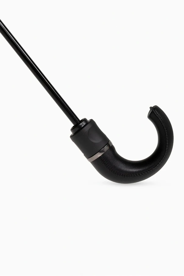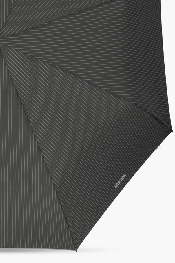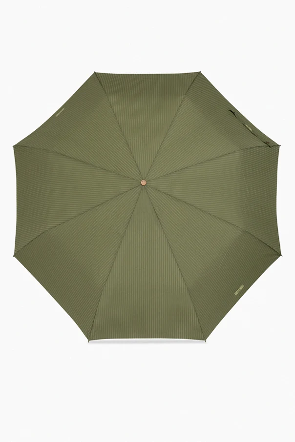 Green folding umbrella from Moschino. Fastened with a snap button, this item features a logo detail, pinstripe pattern, 99% UV protection and black handle. Comes with a case.