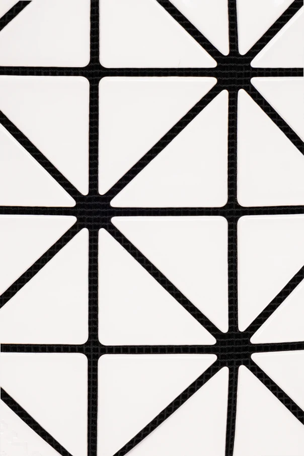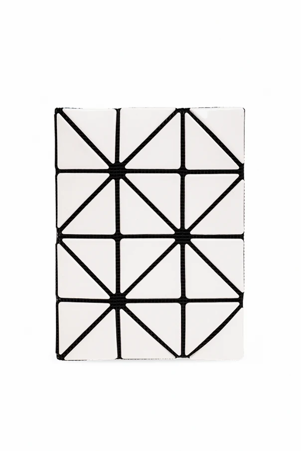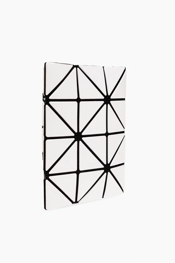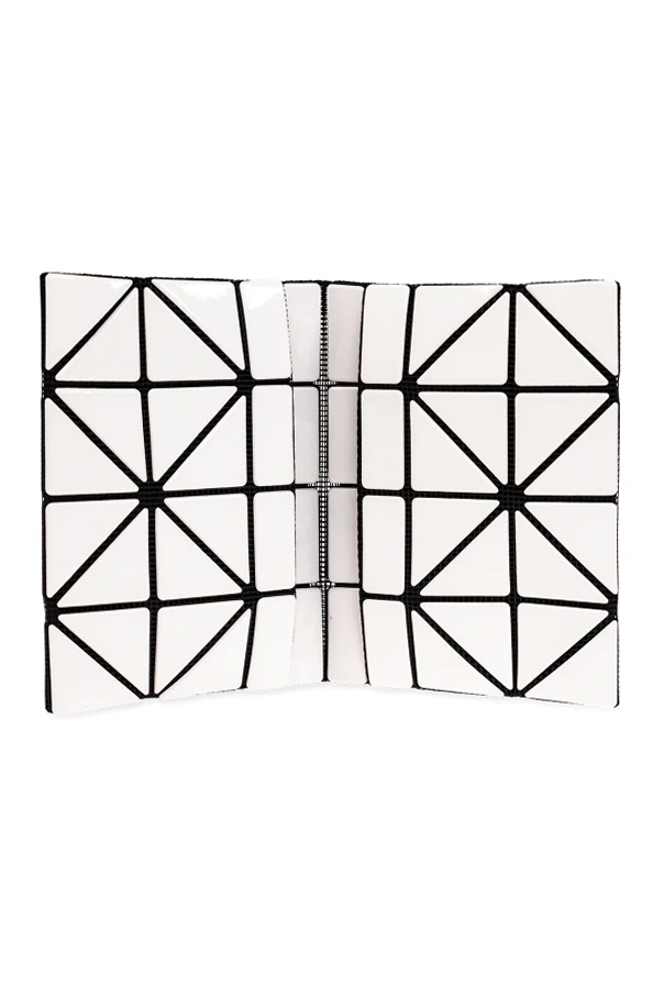 White and black folding card case from Bao Bao Issey Miyake. This item is embellished with an embossed logo and geometrical pattern and features two internal slip pockets.
