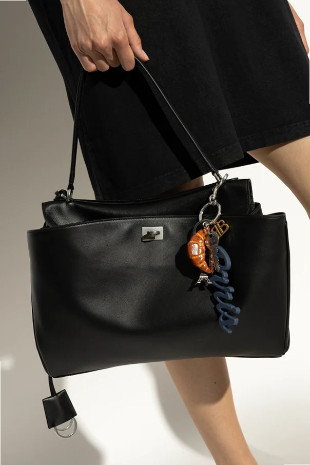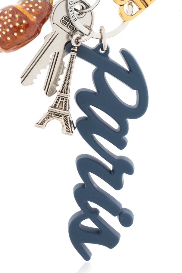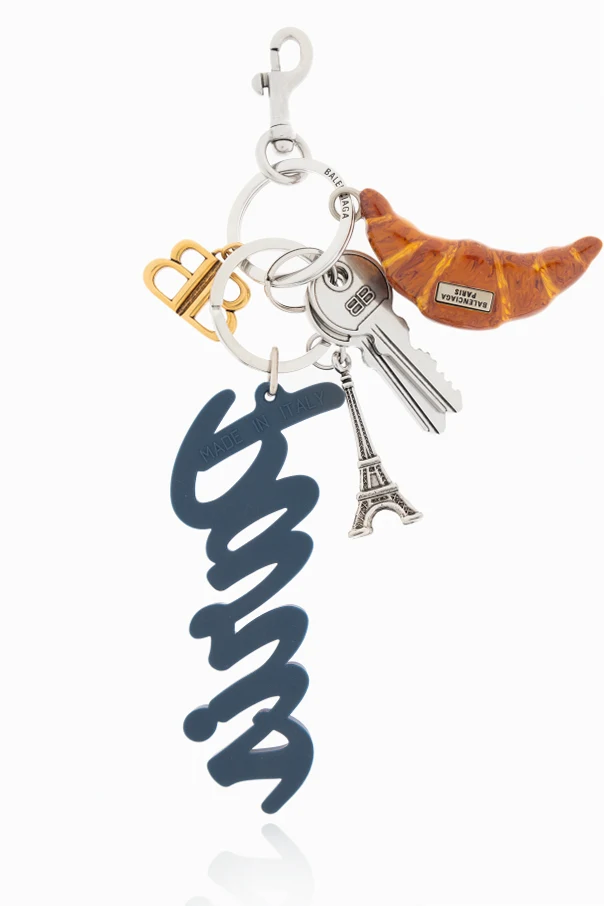 Schlüsselanhänger mit Charms – ein kunstvoll gestaltetes Accessoire, das den Pariser Chic und die moderne Vision des legendären Modehauses Balenciaga perfekt zum Ausdruck bringt. Die raffinierte Komposition besteht aus mehreren charakteristischen Elementen: einem zentralen „Paris”-Schriftzug aus dezent geformtem synthetischem Material in dunkelblauen Nuancen, einem appetitlich wirkenden, äußerst detailgetreuen Croissant-Charm sowie einer silberfarbenen Miniatur des Eiffelturms. Ergänzt wird das Gesamtbild durch edle Metalldetails, darunter ein Schlüssel und ein stilisiertes „BB”-Emblem.
