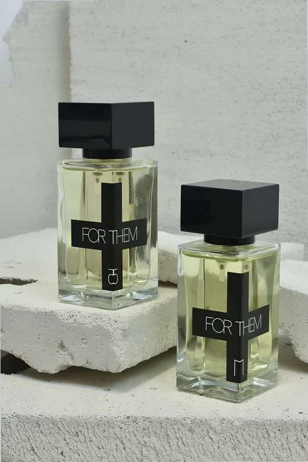 Das Eau de Parfum FOR THEM 1 ist eine Hommage an moderne Eleganz, verkörpert in einer äußerst raffinierten Form. Der Flakon besticht durch seine minimalistische, rechteckige Silhouette mit markanten, scharfen Kanten, während das transparente, massive Glas dezent die gelbe Farbe der Duftkomposition hervorhebt. Das Erkennungszeichen ist das große, schwarze Kreuzmotiv, das im Kontrast zur weißen, geradlinigen Aufschrift „FOR THEM“ steht, welche dezent die zentrale Fläche der Flasche ziert.