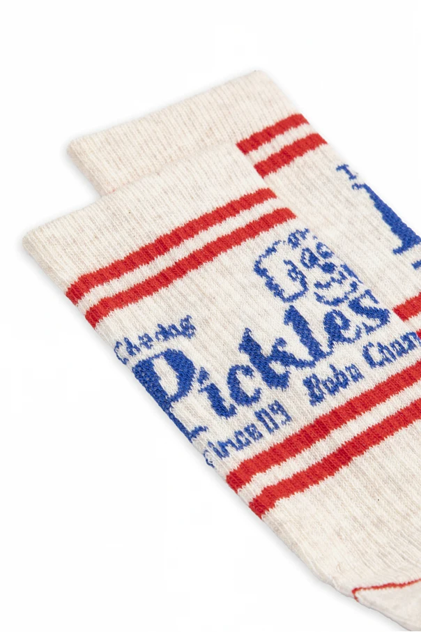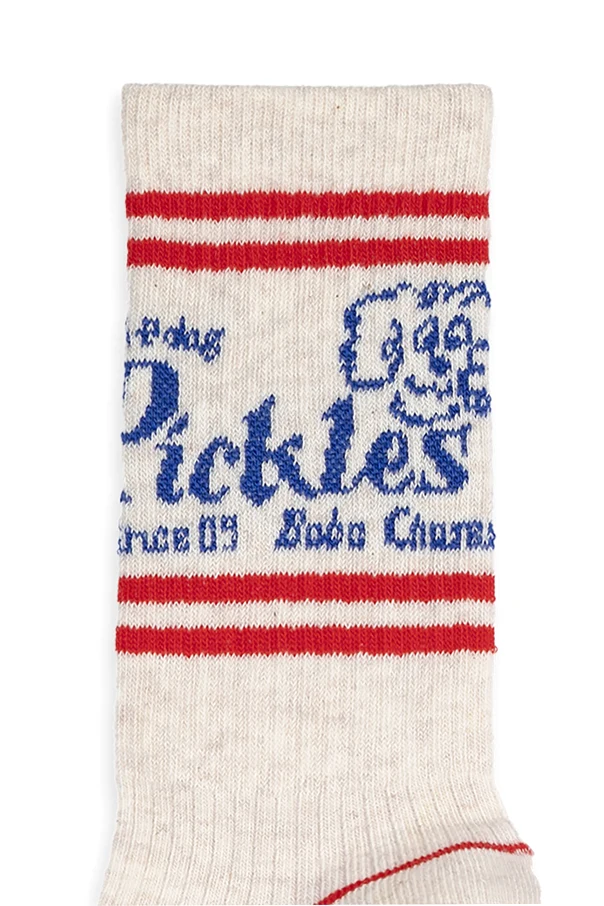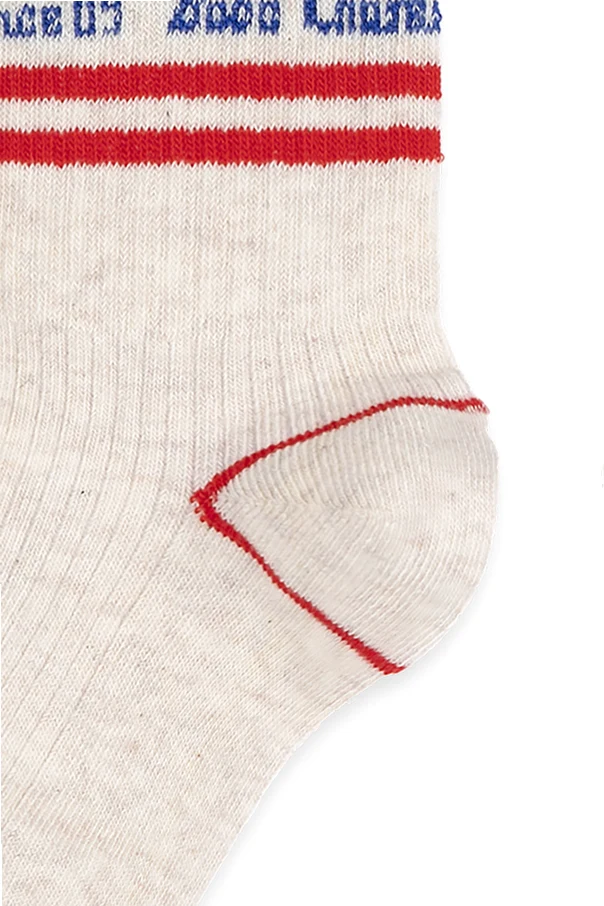 Baumwollsocken mit Logo der Marke Bobo Choses verkörpern Raffinesse und kindliche Lebensfreude, harmonisch verbunden mit modernem Stil. Der klassische, längere Schnitt bis zur Mitte der Wade in einem edlen, hellen Creme-Ton wird dezent durch doppelte, rote Streifen am oberen Rand sowie an den Zehen und der Ferse akzentuiert.