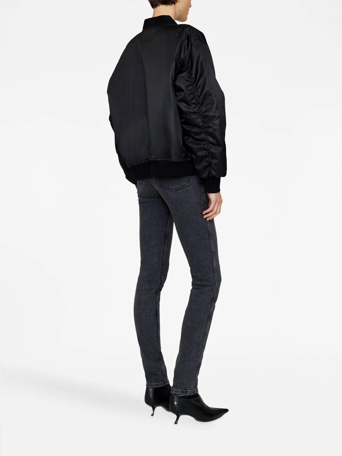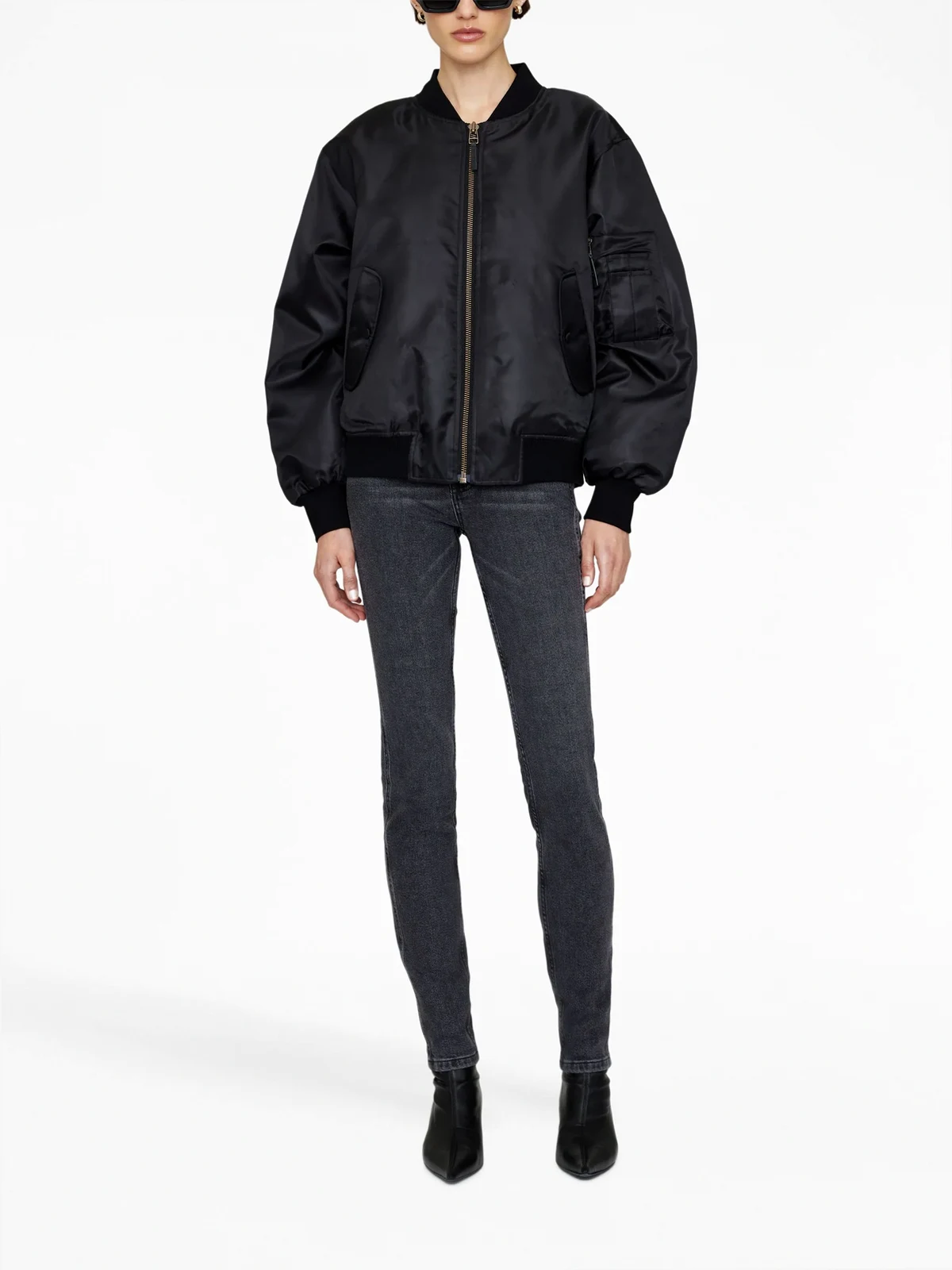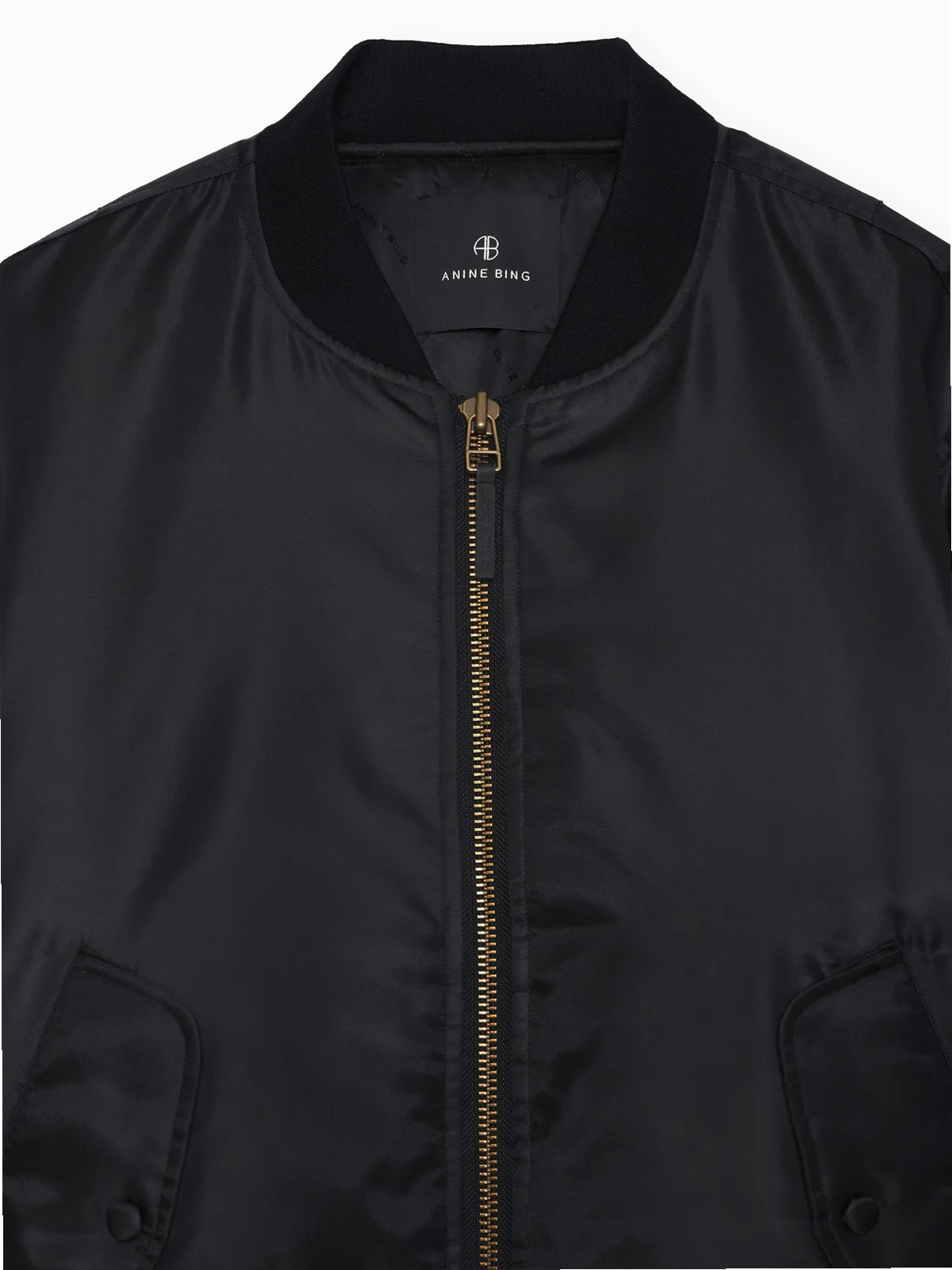 Schwarz, gleichfarbige Nähte, gerippter Stehkragen, Reißverschluss vorne, lange Ärmel, zwei Pattentaschen vorne, aufgesetzte Ärmeltasche.