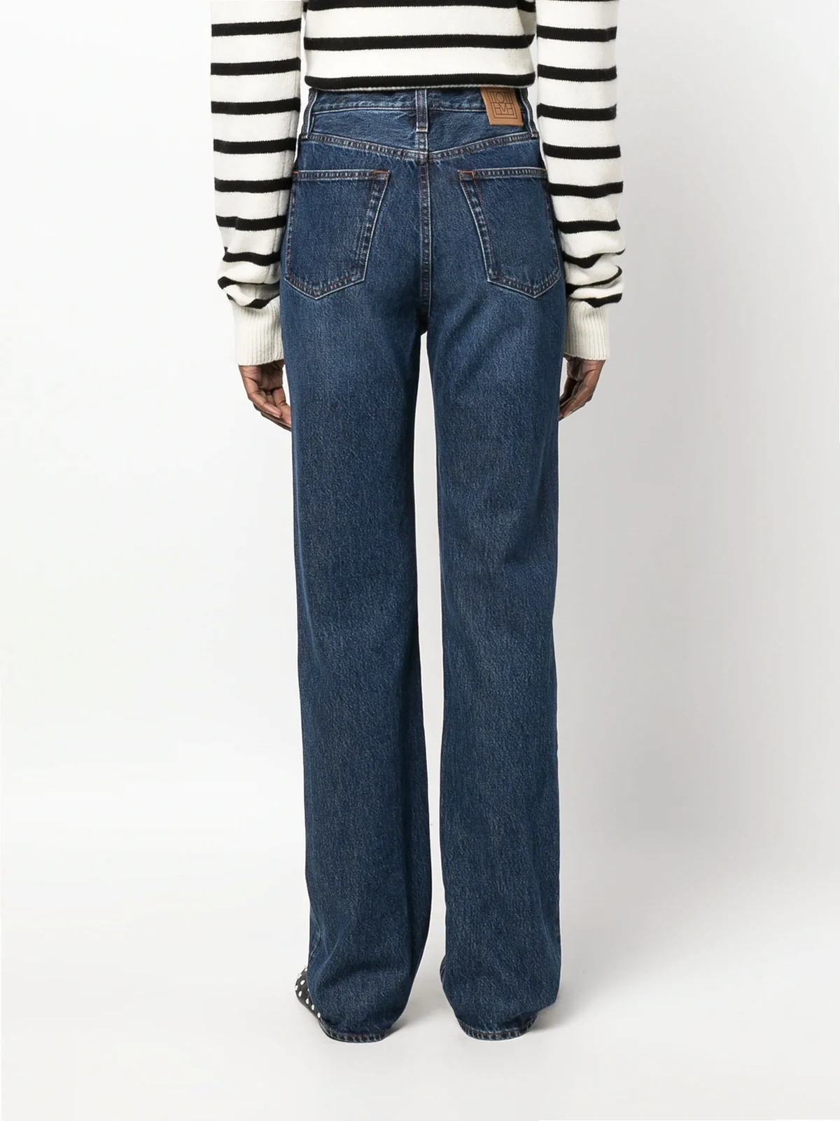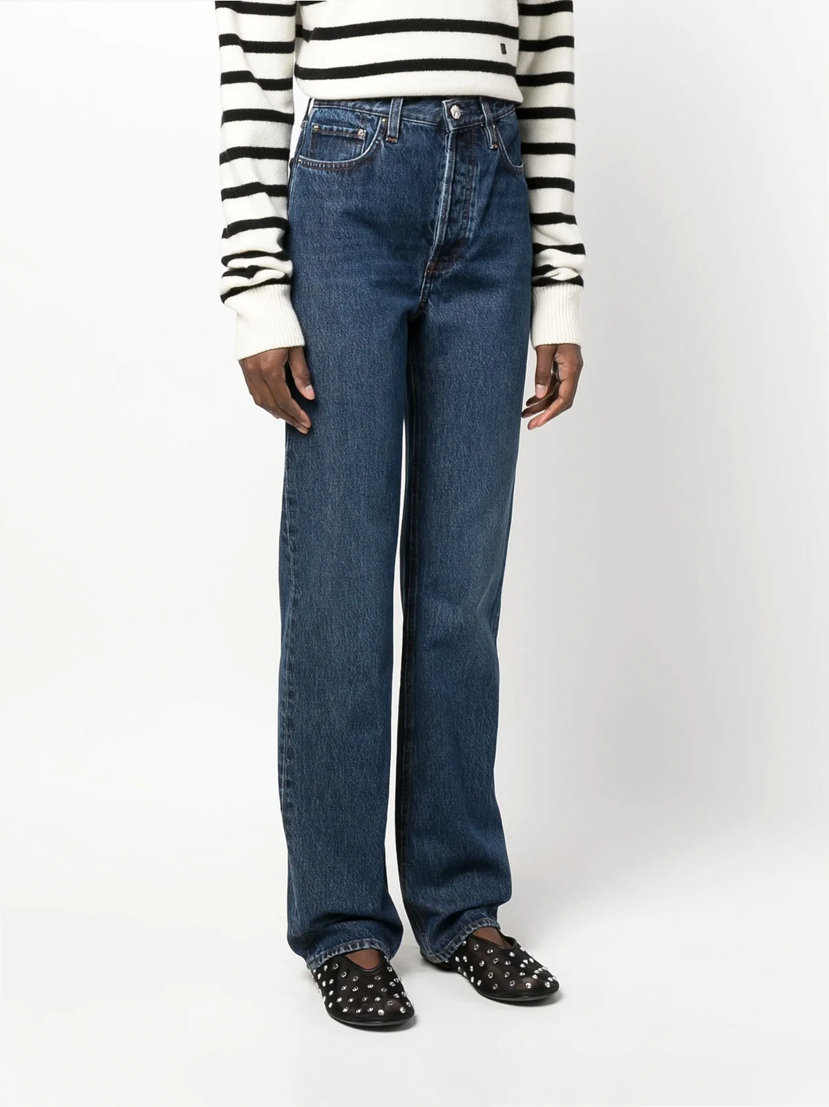 Indigoblau, Baumwolle, taillenhoher Schnitt, Gürtelschlaufen, geknöpfter Hosenschlitz, Five-Pocket-Design, gerades Bein.