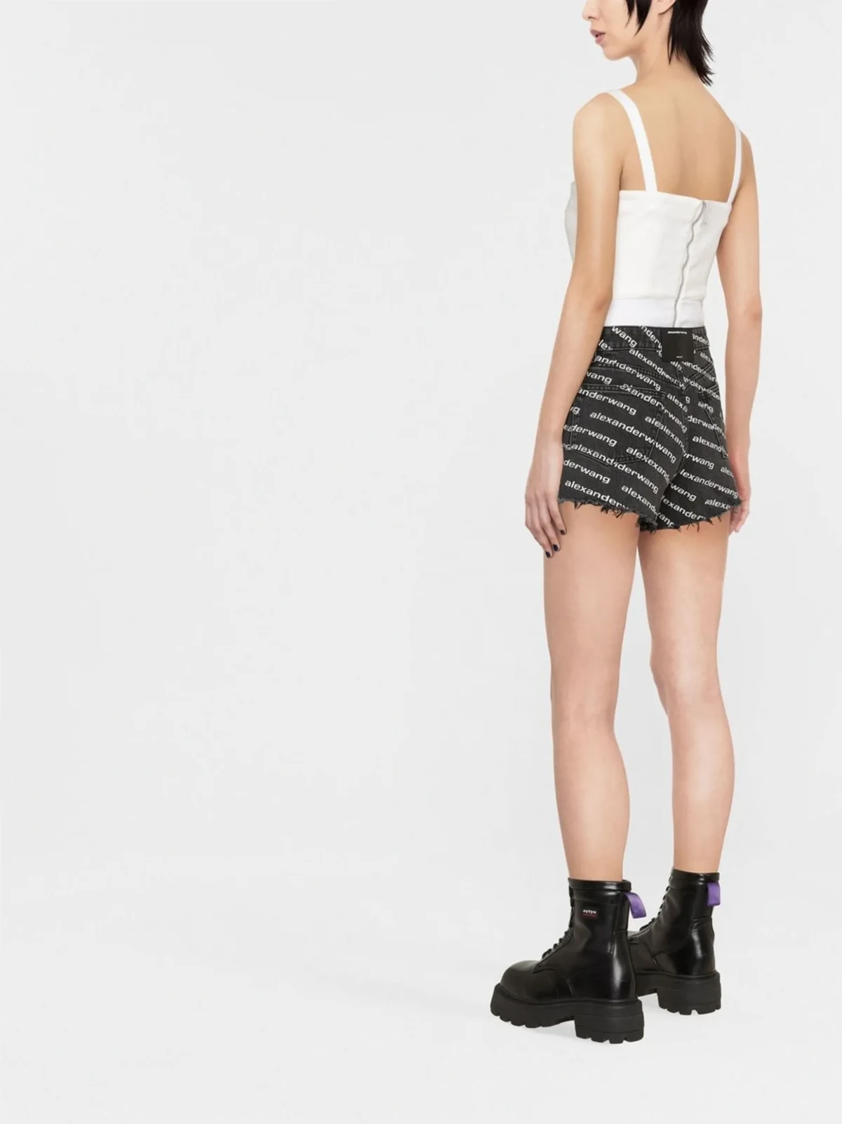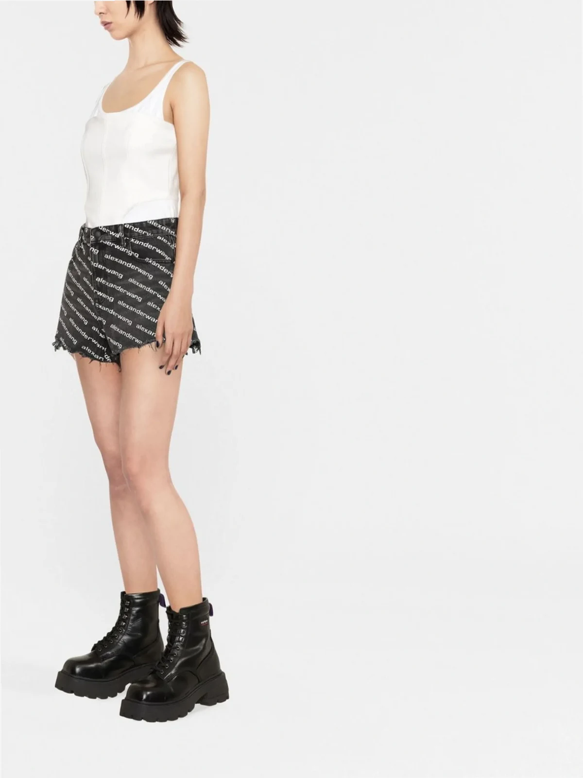 Schwarz, Baumwolle, ausgeblichener Effekt, hohe Taille, Gürtelschlaufen, Knopf- und Reißverschluss vorne, durchgehender Logo-Print, Five-Pocket-Design, offener Saum.