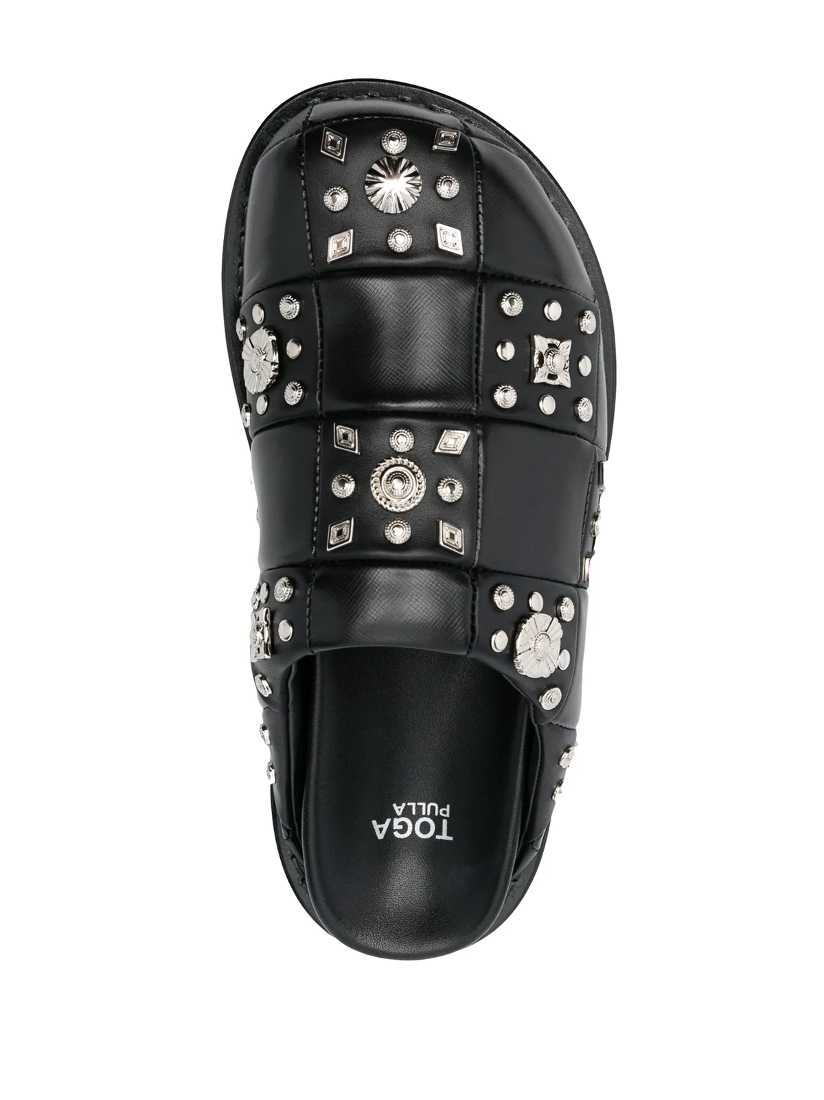 Schwarz, Kalbsleder, silberfarbene Nieten, ohne Verschluss, Logo-Prägung im Fußbett, ohne Ferse, runde Kappe, geriffelte Gummisohle.