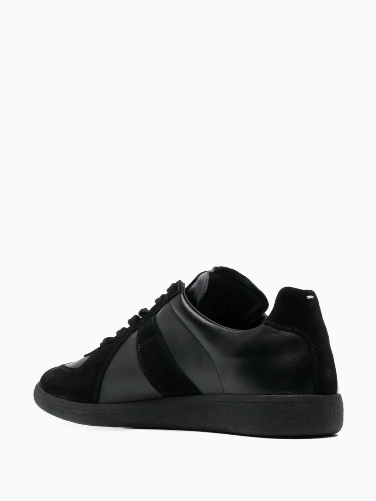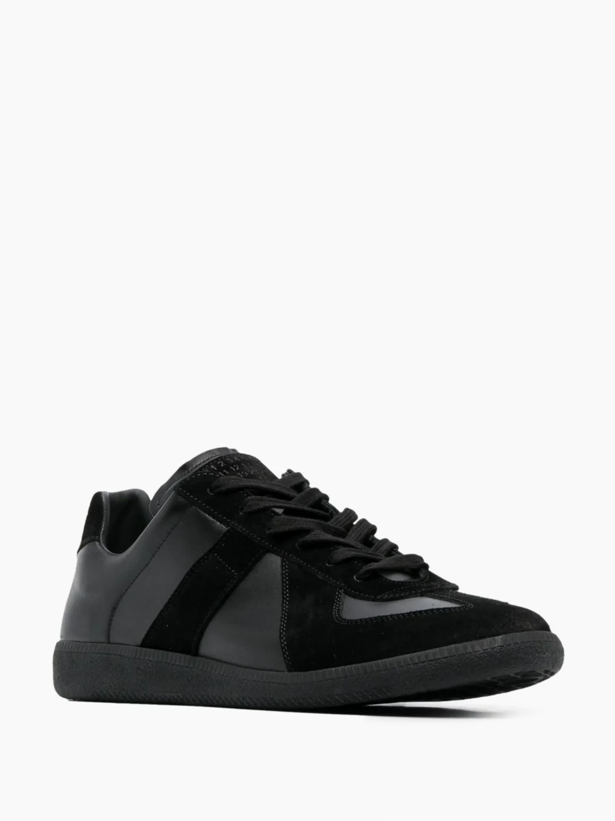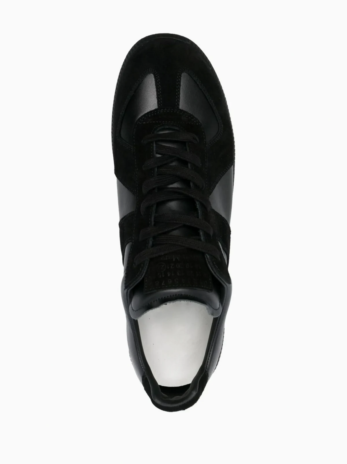 Schwarz, Kalbsleder, Wildleder-Einsätze, mehrere Einsätze, aufeinander abgestimmte Farbtöne, runde Kappe, Schnürung vorne, Logo-Prägung im Fußbett, flache Gummisohle.