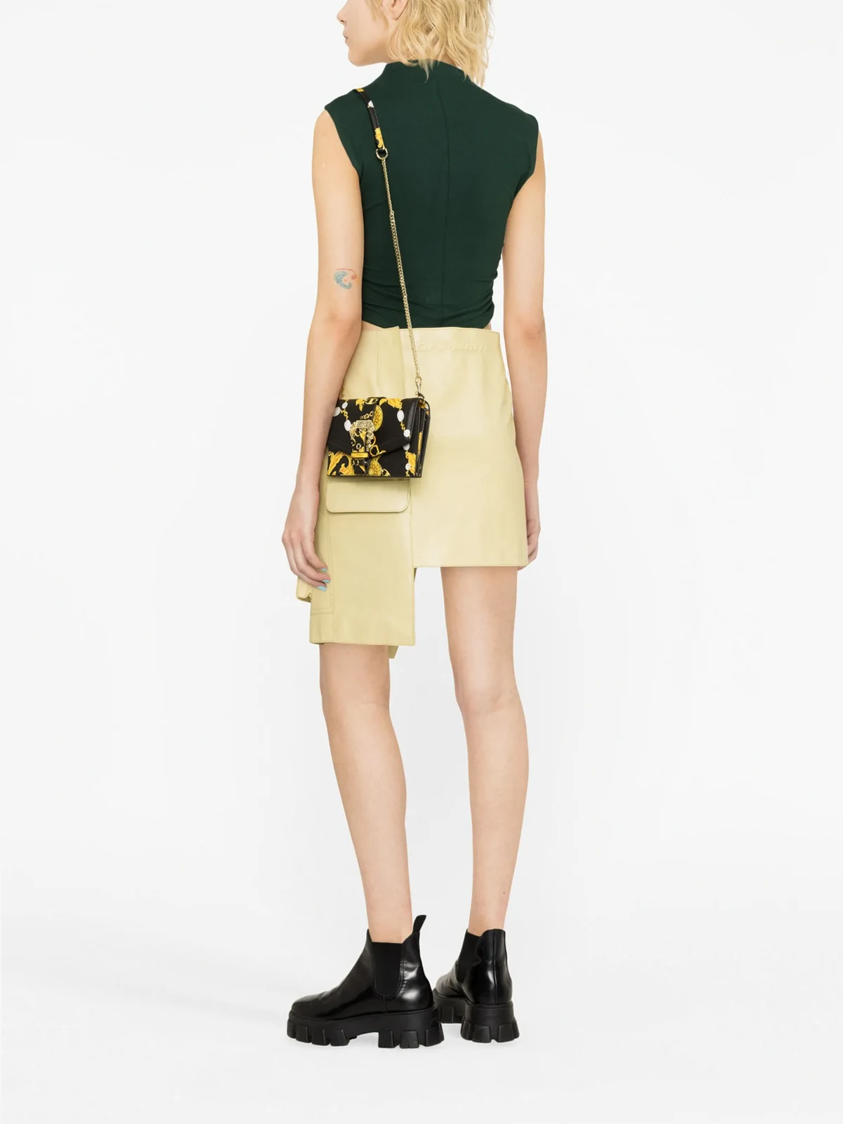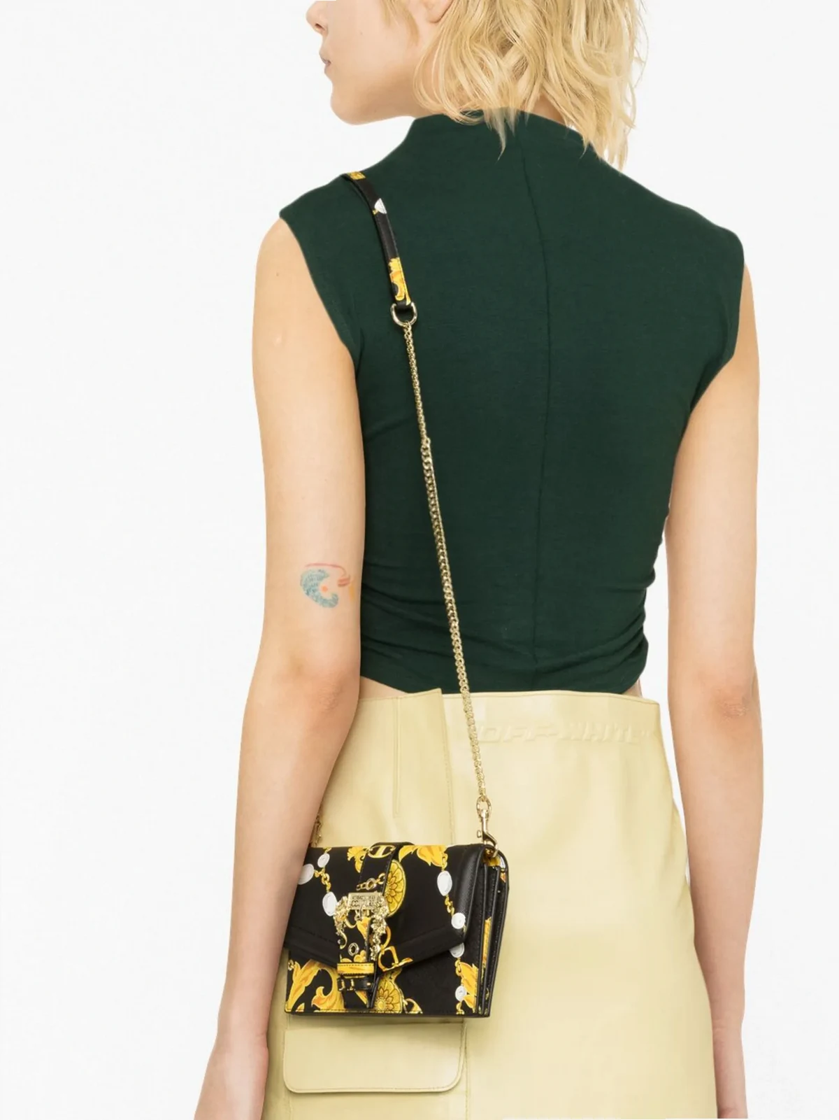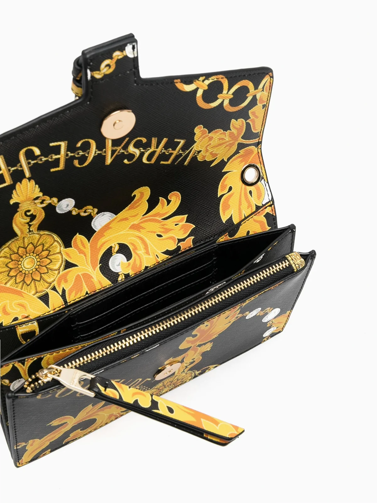 Jet Black, Mehrfarbig, Faux-Leder, Barock-Print, Schnalle mit Logo-Gravur, Klappe mit Magnetverschluss, Schnallenverschluss, abnehmbarer Kettenschulterriemen, unterteiltes Fach, Reißverschlusstasche innen, Kartenfächer innen.