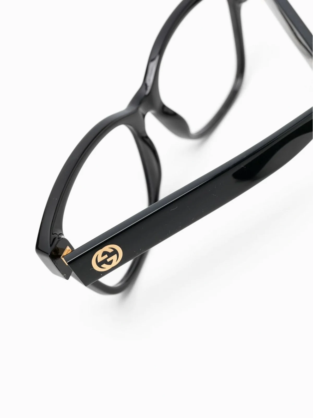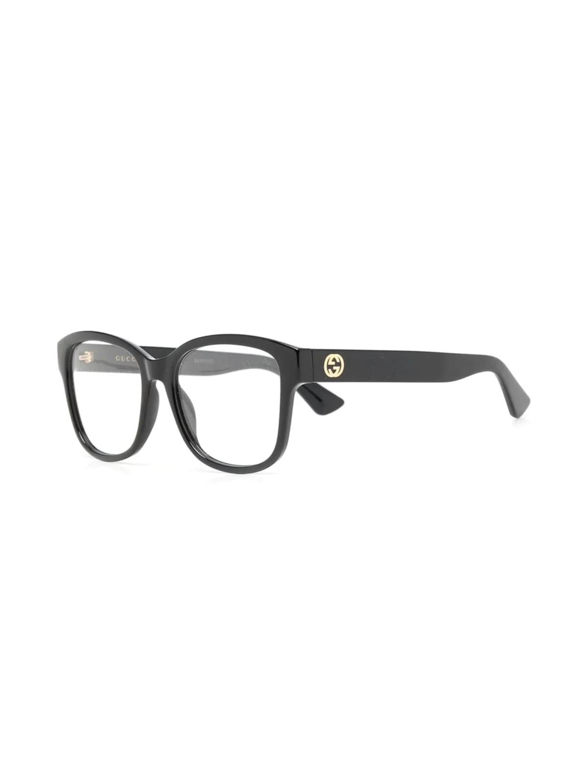 Schwarz, Bügel mit Logo-Gravur, eckiges Gestell, klare Gläser, gerade Bügel, abgerundete Enden.