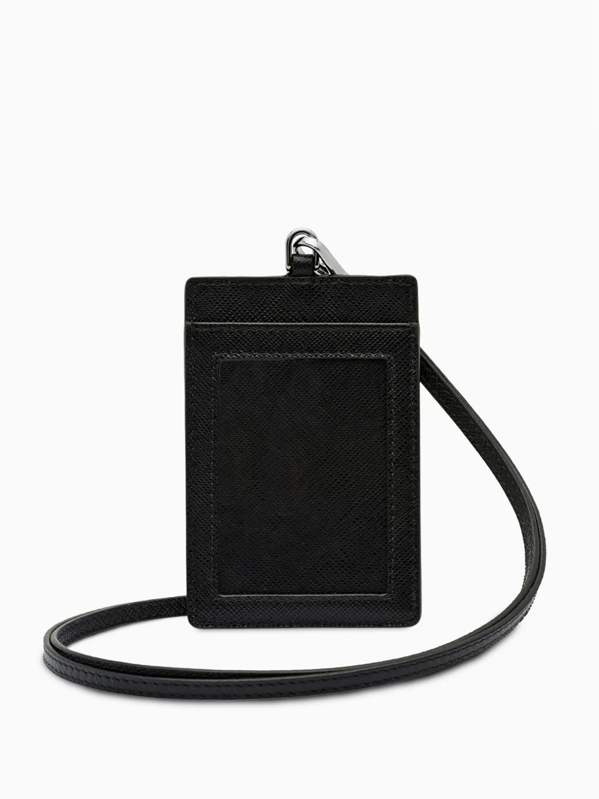 Strukturiertes Design, Logo-Schild. Farbe: Schwarz. Material: Leder.