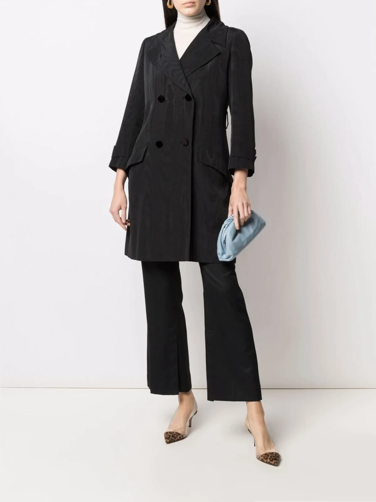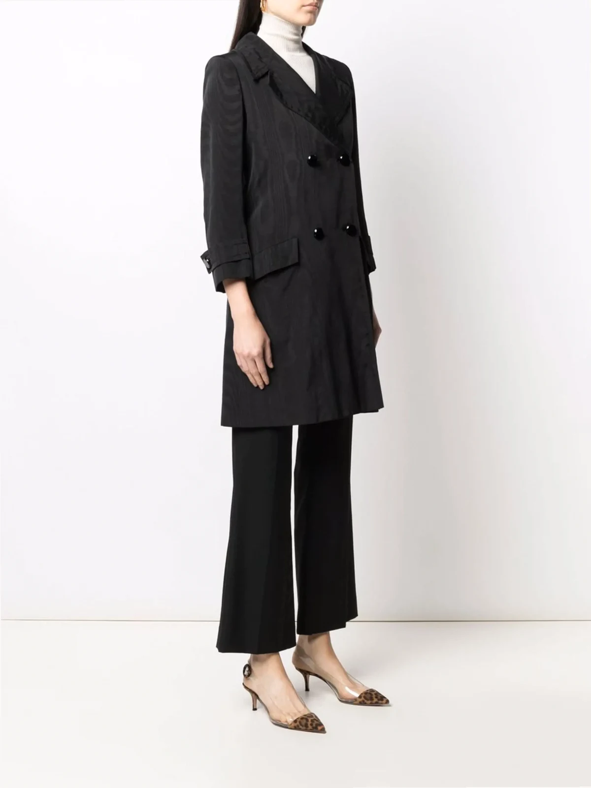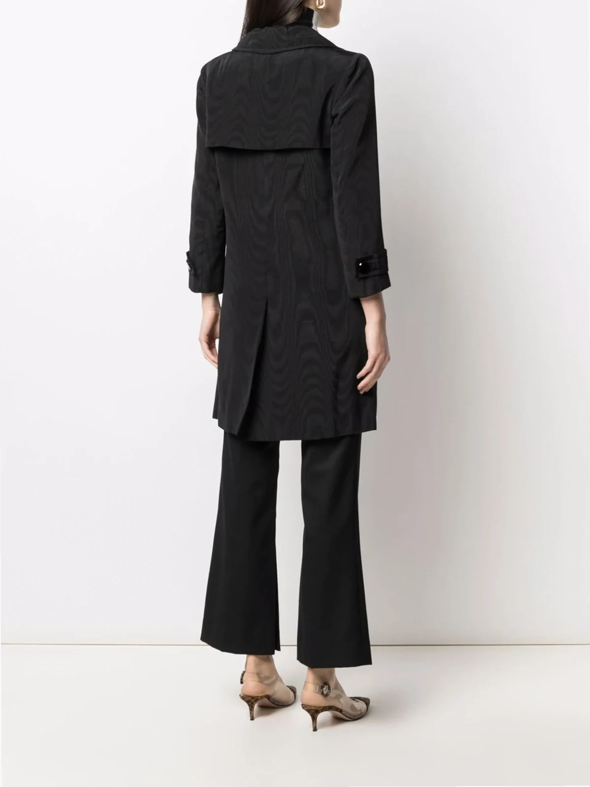 Fallendes Revers, doppelreihiger Knopfverschluss, lange Ärmel, Koller, Gürtelschlaufen, zwei Pattentaschen vorne, zentrierter Schlitz hinten, knielang. Farbe: Schwarz. Dieses Teil erzählt seine eigene Geschichte, die sich in kleinen Imperfektionen widerspiegeln kann. Wenn Sie sich für dieses Piece entscheiden, schreiben Sie das nächste Kapitel seiner Storyline. Plus: Sie shoppen nachhaltig und tun etwas Gutes für unseren Planeten.