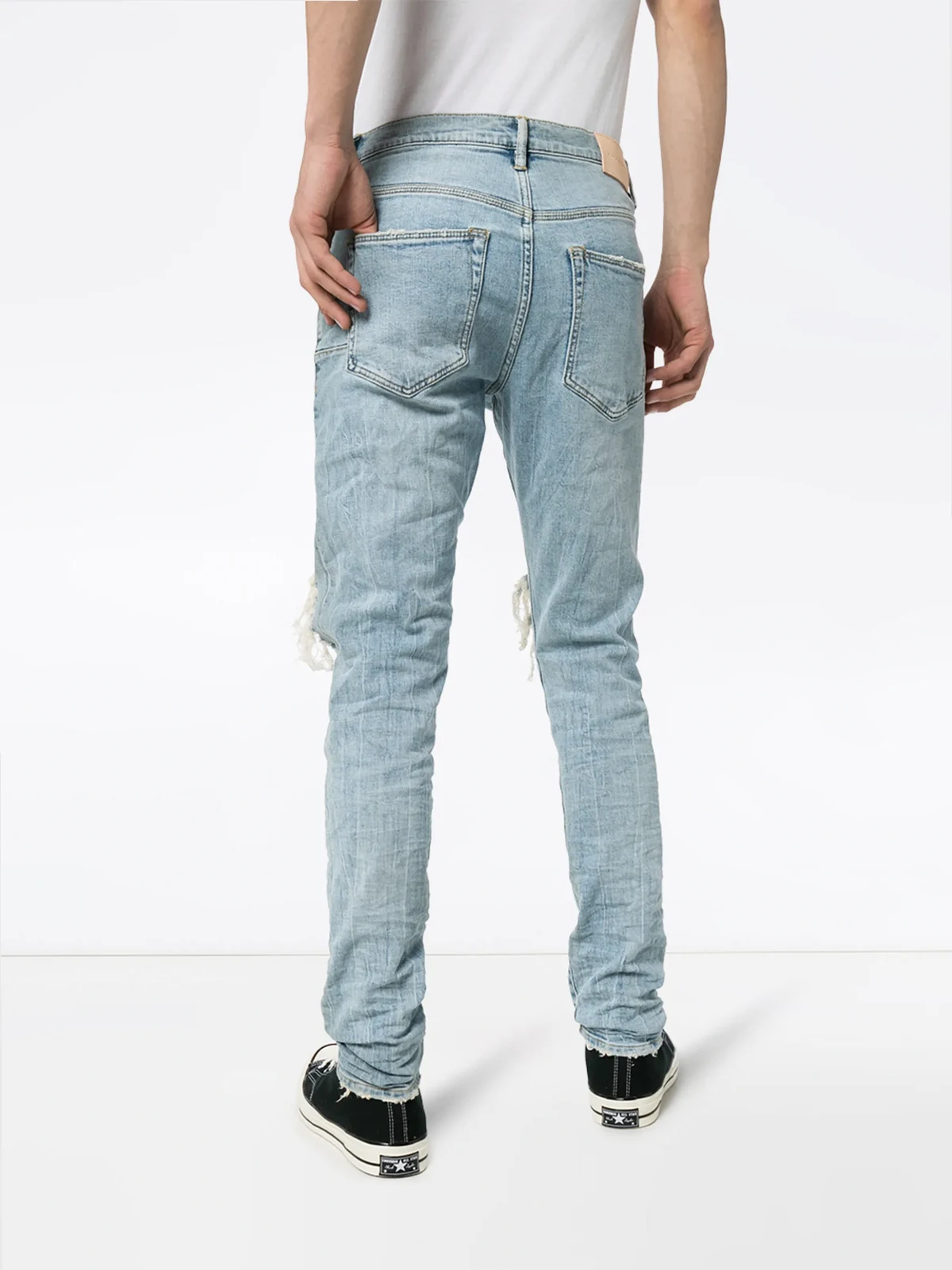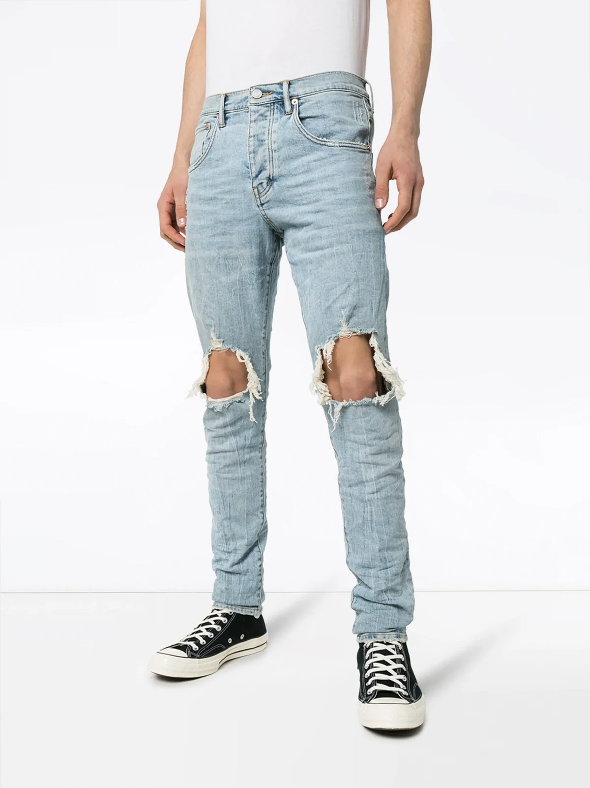 Skinny-Jeans im Destroyed-Look aus Baumwollgemisch von Purple brand. Merkmale: hoher Bund, Five-Pocket-Design, gerades Bein, reguläre Länge und Distressed-Effekt.