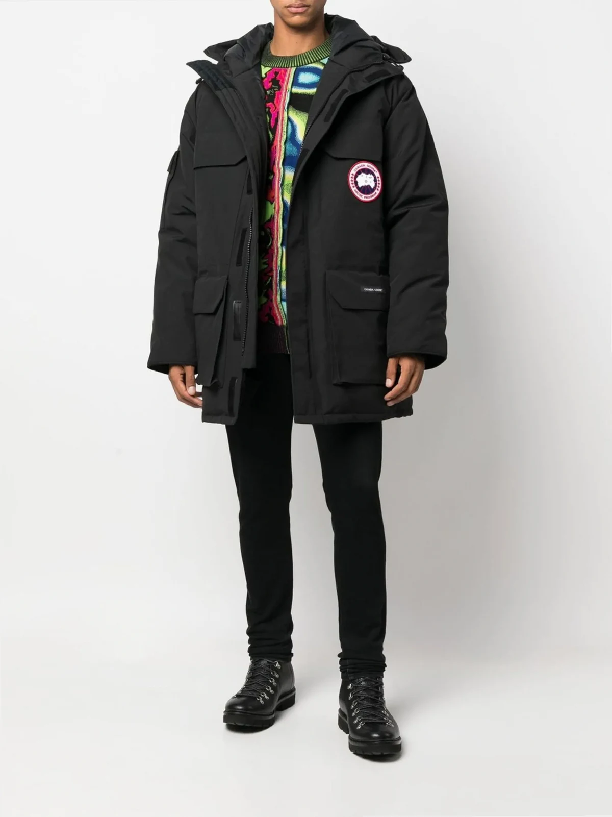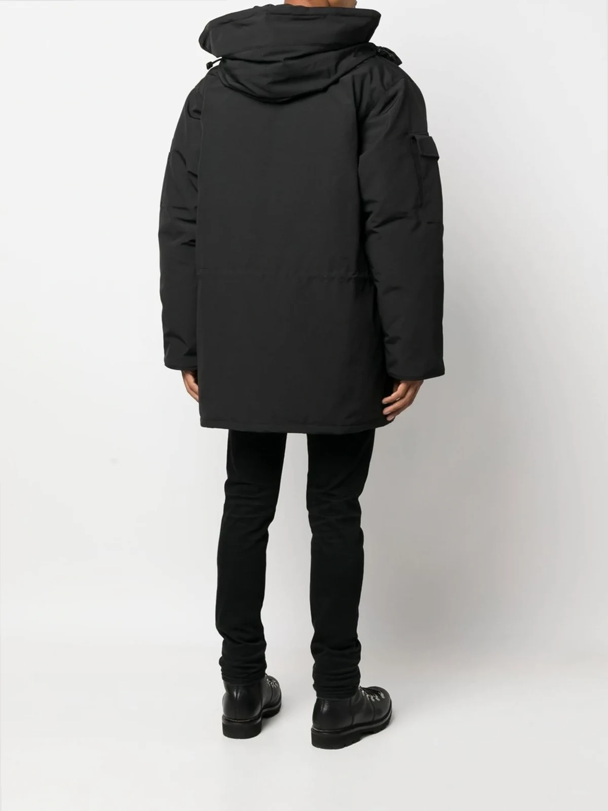 Schwarz, Daunen, Logo-Patch vorne, vier Vordertaschen mit Klappe, klassische Kapuze, Reißverschluss vorne, Pattentasche am Ärmel, lange Ärmel, gerader Saum.
