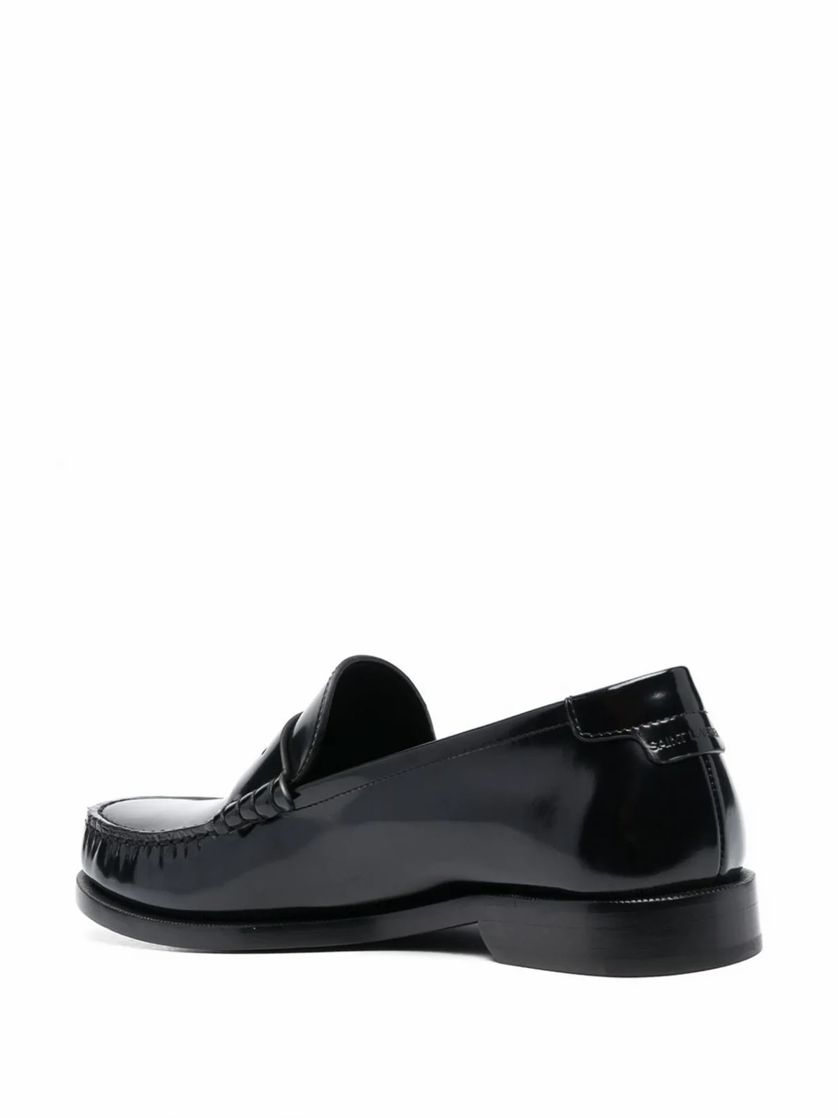 Jet Black, Kalbsleder, Penny-Riemen, Lederinnensohle mit Logo-Prägung, mandelförmige Kappe, flache Ledersohle, niedriger Blockabsatz, ohne Verschluss.