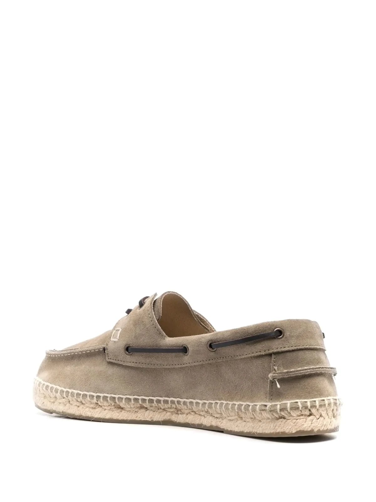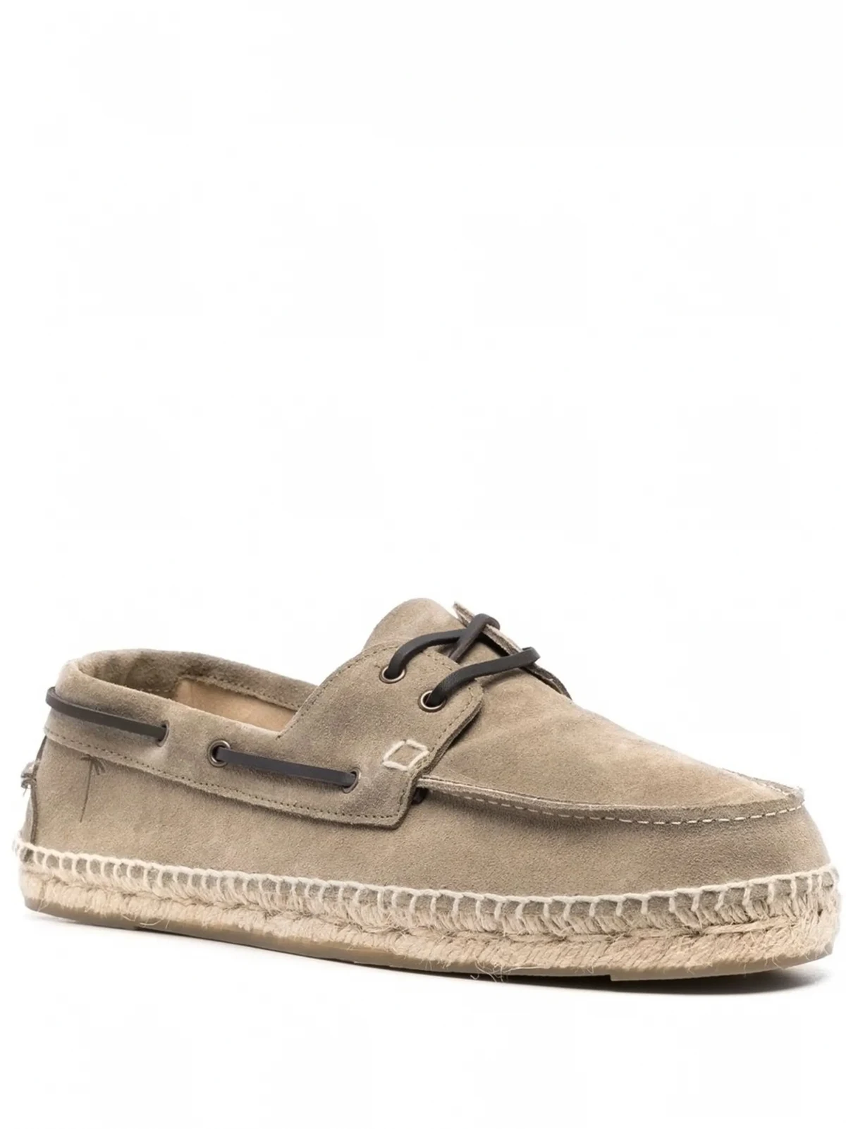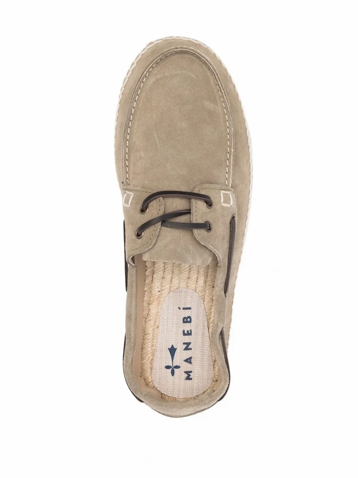 Beige, Kalbswildleder, Logo-Prägung im Fußbett, runde Kappe, Schnürung vorne, geflochtene Bastsohle.
