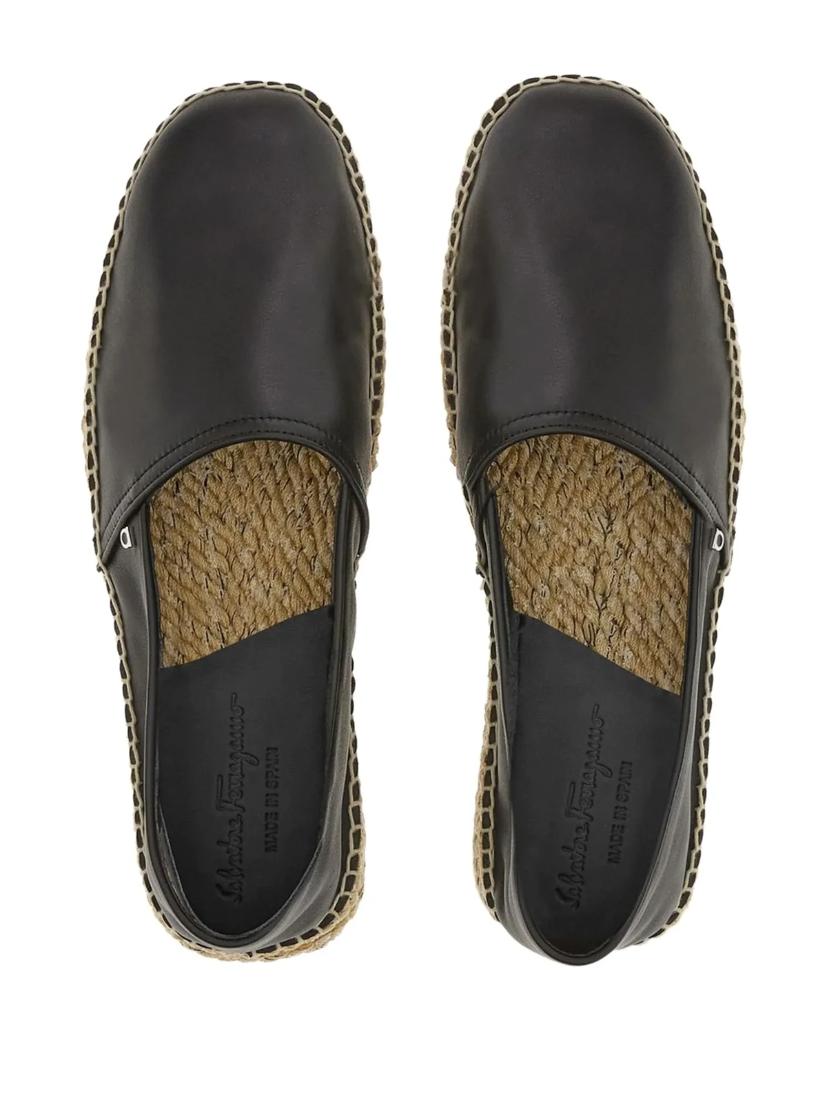 Schwarz, Kalbsleder, runde Kappe, Gancini-Schnalle, Logo-Prägung im Fußbett, geflochtene Bastsohle, ohne Verschluss.